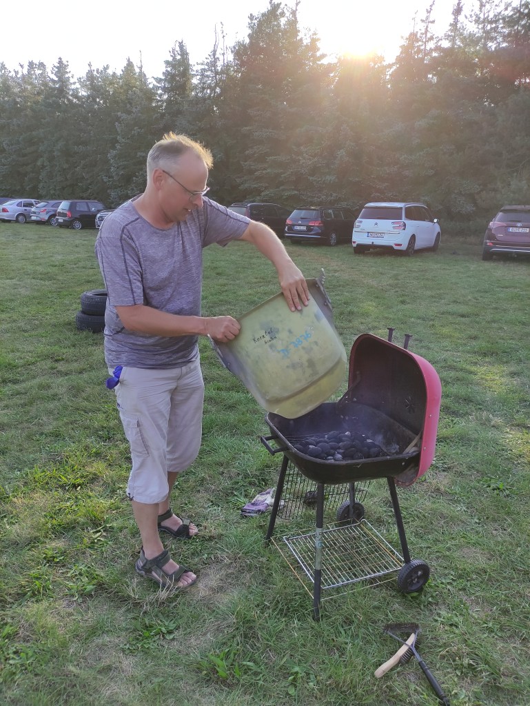 Abends wurde bei strahlendem Sonnenschein noch am Start gegrillt. Ich legte mein Abendessen wohlweislich so, dass ich danach nicht mehr fliegen musste. Zwar habe ich einen wirklich sehr robusten Magen, aber ich wollte mein Glück nicht überstrapazieren. Die Fluglehrer waren anscheinend schon abgehärtet. So wurde noch an der Wurst gekaut, als die Haube geschlossen wurde. Wir hatten sehr viel Spaß! Kurzerhand wurde ein am anderen Ende des Feldes gefundener Kürbis gegrillt (um welche Art es sich genau handelt waren wir uns ehrlich gesagt nicht ganz sicher), was zur allgemeinen Erheiterung sorgte. Ullas Kartoffelsalat war auch wieder der Hammer!