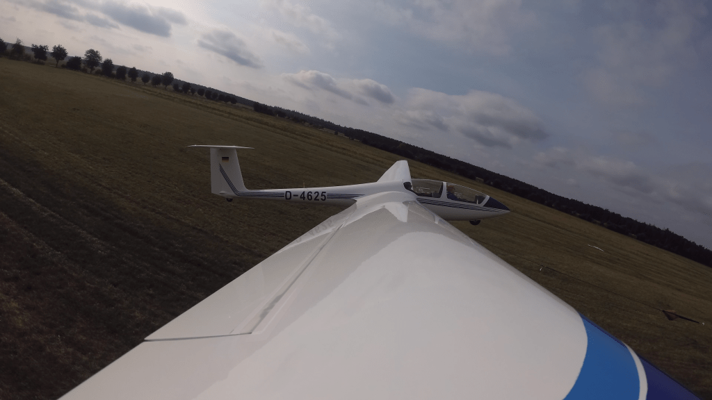 Zuerst drehte ich einige Gewöhnungskreise, um mich an das für mich unbekannte Flugzeugmuster zu gewöhnen (bis auf die drei Starts vom fremden Platz im Jahre 2015 hatte ich keinerlei Flugerfahrung auf der 21). Im Querabflug meldeten wir uns in der Box an, wackelten mit den Flächen als Zeichen, dass es jetzt los ginge. Und das tat es! Schwupps waren wir im Rückenflug!