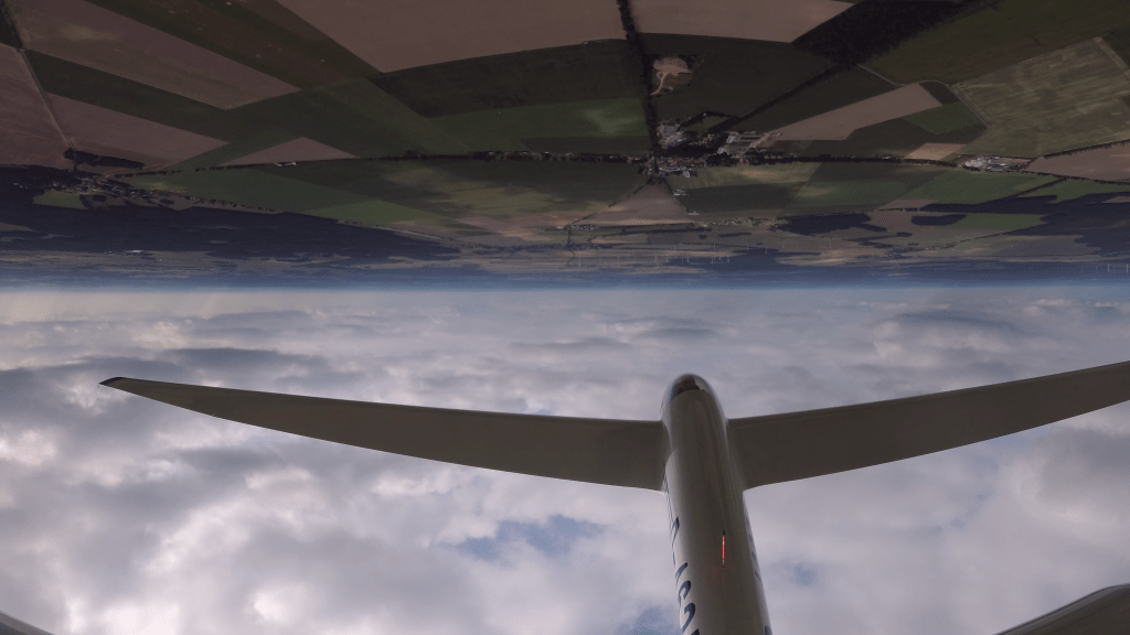 Zwar verbrachten wir die meiste Zeit nach wie vor im Rückenflug, aber das fühlte sich inzwischen schon ganz gut an. Die nächste Figur auf der Liste war der Aufschwung, welcher quasi ein halber Loop ist, bei dem man sich im oberen Scheitelpunkt mithilfe einer halben Rolle wieder in die Normalfluglage dreht. Diese Figur ist auch bekannt als Immelmann (benannt nach dem deutschen Jagdpiloten im ersten Weltkrieg Max Immelmann). Klingt einfach, ist aber in einem Segelflugzeug gar nicht so einfach, da man oben wohldosiert das Höhenruder leicht nachlassen muss, sodass in einer akzeptablen Zeit (die ASK21 braucht recht lange, um auf dem Rücken wieder Fahrt aufzuholen) wieder genügend Geschwindigkeit anliegt, um zu rollen.
