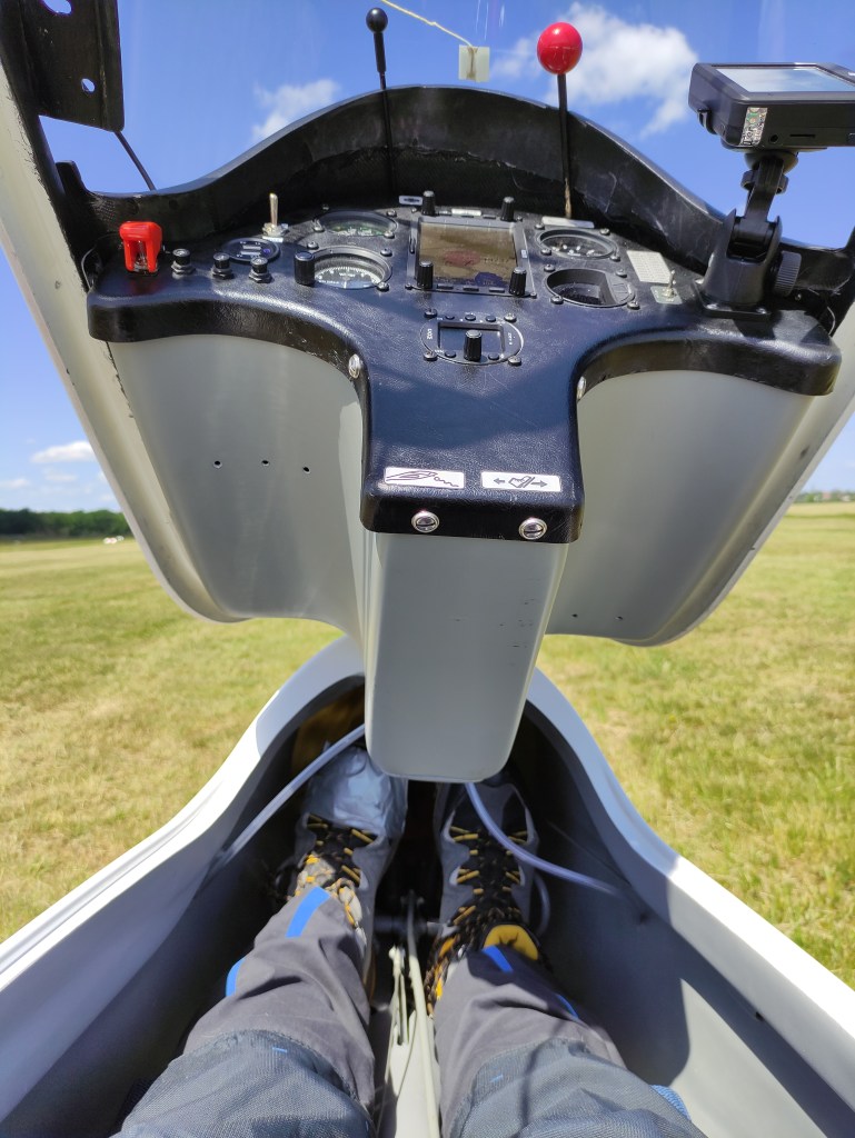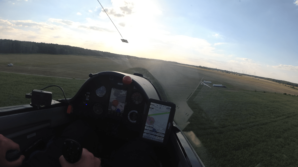 Wieder am Start kalkulierte ich mir drei Optionen aus: Einpacken, Strecke kürzen oder es einfach trotzdem probieren. Ich entschied mich für Nummer drei und machte es mir schon mal im Cockpit bequem, während mir Steffen ein neues Seil brachte (Sigurd hatte beim zweiten Start mehr Glück und kreiste sich bereits nach oben).