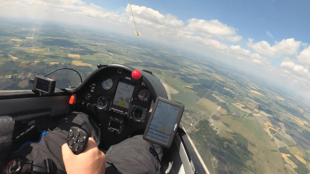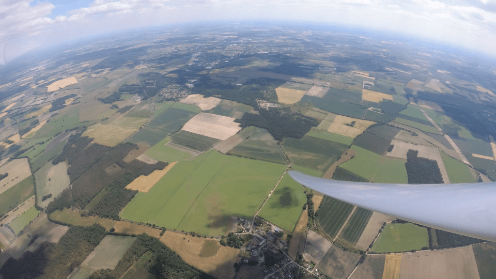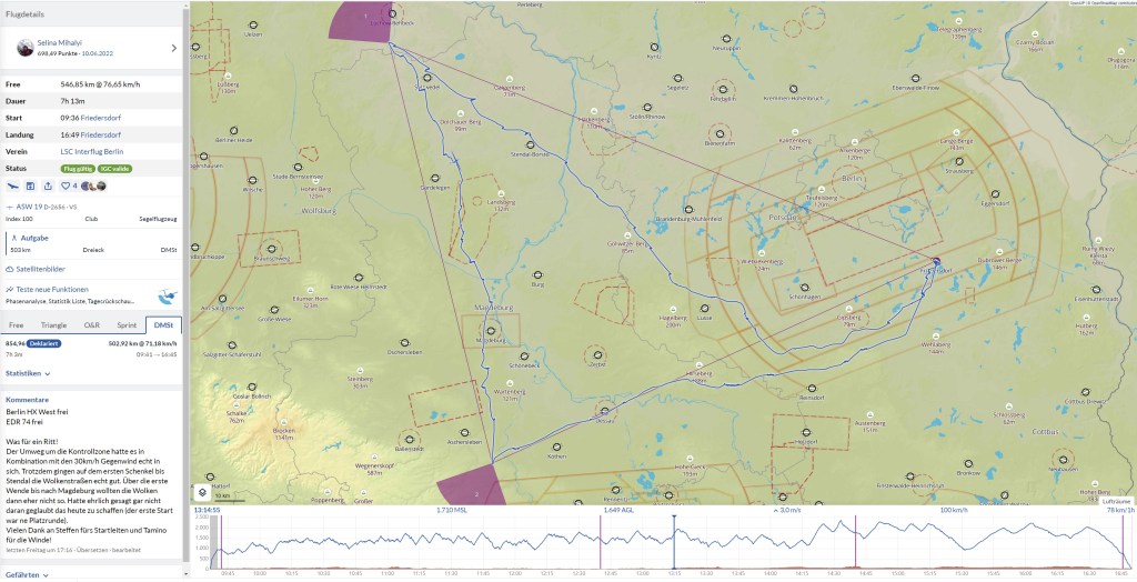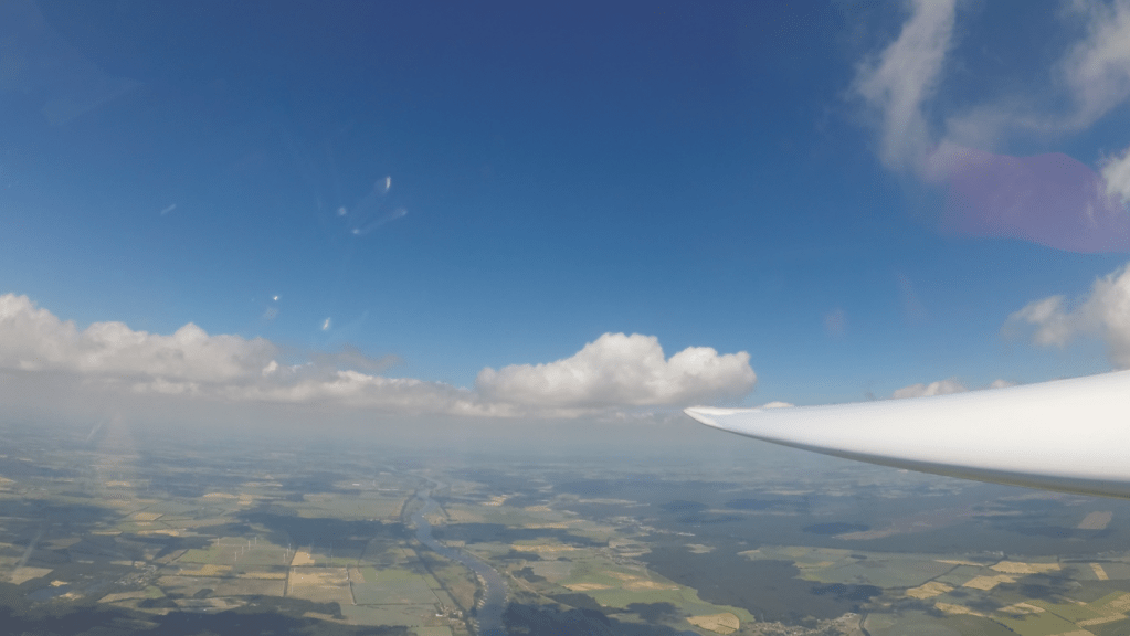 Nachdem ich endlich den Berliner Luftraum hinter mir lassen konnte, war es mir möglich direkten Kurs zu nehmen. Zwar musste ich jetzt quer zu den Wolkenstraßen fliegen, aber die Wolken zogen zuverlässig mit 2-3m/s und ich konnte noch einiges an Geschwindigkeit gut machen (meine Aufgabengeschwindigkeit konnte ich zu dem Zeitpunkt auf sagenhafte 50km/h verbessern…ich rechnete mir schon aus, ob ich es überhaupt bis zum Sonnenuntergang schaffen könnte).