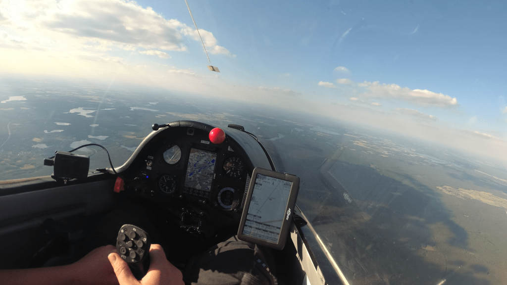 Ich peilte eine schöne Wolke auf Kurs Tropical Islands an und flog erst mal durch tote Luft. Ich befürchtete schon, zu spät dran zu sein und überlegte, auf direktem Weg nach Hause zu fliegen. Mit 1500m konnte ich locker in den Luftraum eintauchen, aber ich hatte noch gute 50km Weg vor mir und bräuchte nochmal ein paar hundert Meter. Zwar lagen einige Wolken auf Kurs, aber bekannterweise ist diese Passage sehr tückisch. Sie kann gut tragen, dich aber auch gnadenlos mit 4m/s Sinken hinunterspülen. Da die besagte Wolke nicht zog, entschied ich mich kurzerhand noch die Nächste auszuprobieren. Diese war zwar ein paar Kilometer entfernt, aber sah im Gegensatz zu den Wolken auf direktem Kurs noch schön strukturiert aus. In 1380m hob sich sachte eine Fläche und ich tastete mich zum Steigen. 1m/s. Nicht der Brüller aber der Rückenwind unterstützt mich ja. Es geht ja jetzt nur noch darum, Höhe zu machen und nach Hause zu kommen. Innerhalb von 8 Minuten war ich wieder kurz unter der Basis und der Höhenmesser zeigte 1900m an. Jetzt sollte eigentlich nichts mehr schiefgehen! Parallel zur Luftraumgrenze flog ich Richtung Nordosten und verringerte so die Entfernung zum Heimatflugplatz. Als ich tief genug war, um in den nächsten Luftraum einzutauchen, bog ich nach Norden ab. Zwar gab es streckenweise großes Sinken, aber zum Glück bin ich auf Nummer Sicher gegangen und habe mir genug Höhenpuffer eingeplant. So kam ich ganz entspannt zu Hause an!