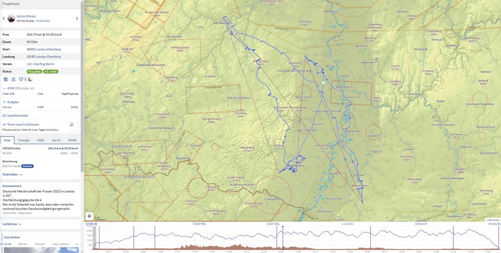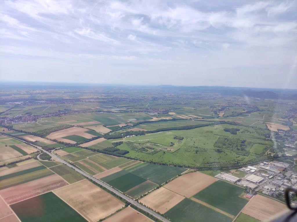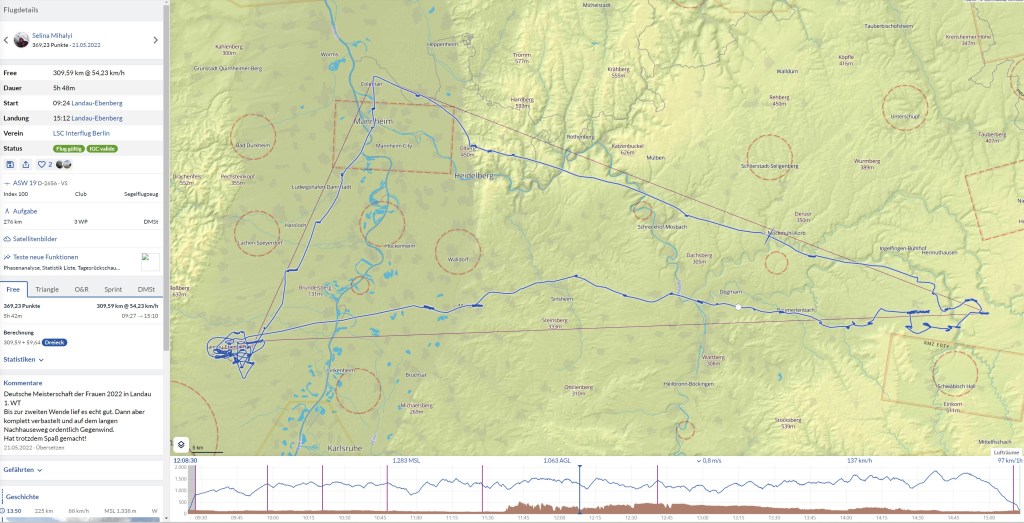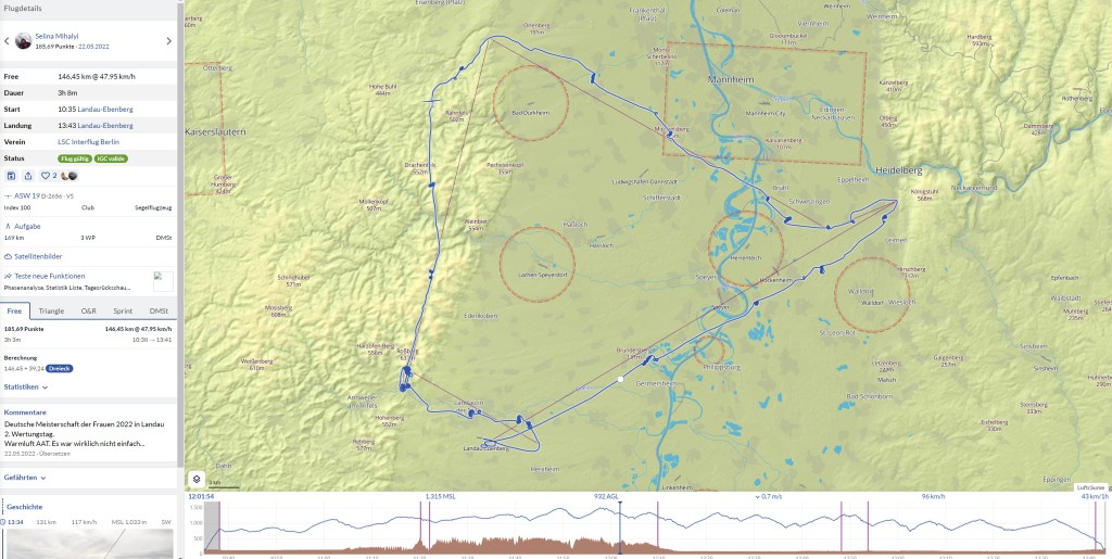 Südlich von Ludwigshafen trat ich erneut einen 2m Bart ein und aufgrund der hohen Basis von fast 2000m fing es wieder an richtig Spaß zu machen. Meine Schnittgeschwindigkeit (die zur ersten Wende bei irgendwas um die 40km/h lag) ging langsam aber stetig wieder nach oben und der Weg zur südlichen Wende klappte ausgezeichnet. Ich traf eine gute Linie unter einer Wolkenstraße und kam bis Bruchsal ohne einen Kreis. Da nun alle Mädels unseres Camps ungefähr in der gleichen Ecke flogen, konnte man sich gut absprechen und gegenseitig Tipps geben. Es zeichnete sich zwar ab, dass die Wende ein gutes Stück im Blauen lag, aber die Wolke beim Hinterkatzenberg (ab und an interessiert es mich doch brennend, wie solche Namen entstehen) brachte mich auf entspannte 1600m. So glitt ich den restlichen Weg zur Wende ab und flog die gleiche Wolke auf dem Rückweg erneut an. Dieses Mal brachte diese mich auf 1900m und ich teilte den Mädels im Funk diese Wolke als Geheimtipp mit. Nun folgte wieder eine größere Strecke durchs Blaue und über Herrenteich (heute war die Sprungzone zum Glück nicht aktiv) suchte ich unter den dortigen Wolken vergebens nach dem Steigen. Da ich aber noch entspannte 1300m hatte, flog ich einfach weiter (ich war inzwischen trotz des mühseligen ersten Schenkels wieder tiefenentspannt und mit mir, dem Fliegerchen und dem Universum wieder im Einklang). Kurz vor Mannheim war mir das Glück wieder hold und nun ging es wieder mit 2m/s auf fast 2000m. Hier und da sammelte ich nochmal etwas Höhe und erreichte auch bald schon die dritte und letzte Wende. Inzwischen waren wir Mädels alle wieder mehr oder weniger zusammen (wenn auch in verschiedenen Höhen) und suchten gemeinsam den Endanflugbart. Es waren noch 40km, aber inzwischen hatte der Wind gedreht und pustete mit 20 Klamotten auf die Nase. Leider entschied ich mich für die falsche Wolke und wurde überholt, da ich ein wenig länger für die Höhe brauchte als die anderen. Sei’s drum!