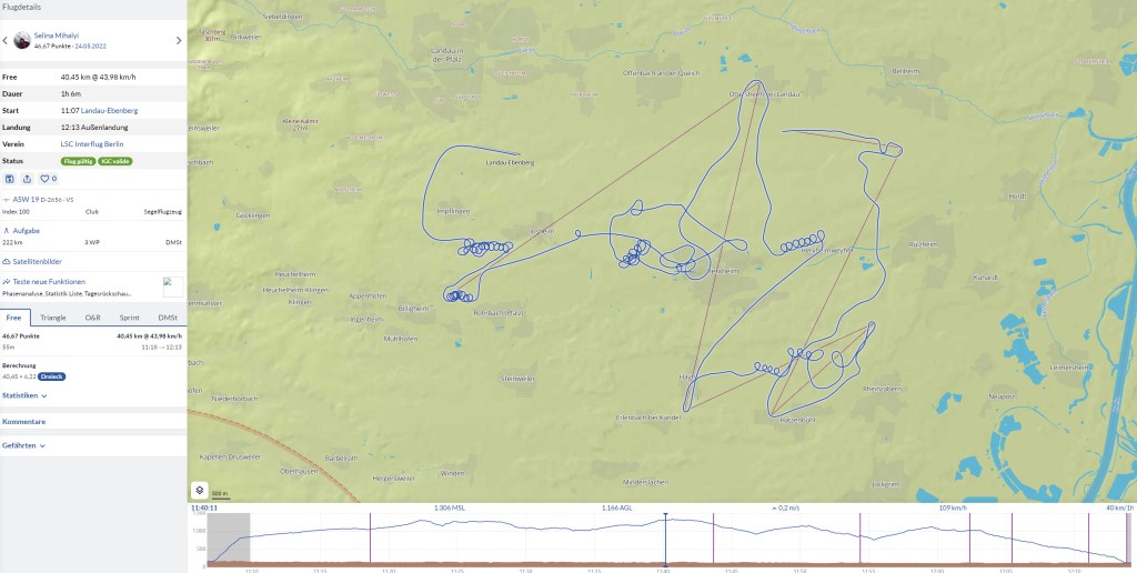 Wir hatten starken Wind aus Westen, der die Bärte immer wieder versetzte. Außerdem war irgendwie der Wurm beim Pulken drin. Nicht selten musste ich waghalsige Ausweichmanöver machen, um von gewissen Piloten (die mir immer wieder zu nahe kamen) nicht abgeschossen zu werden. So musste ich den eigentlich vielversprechenden Bart aus Sicherheitsgründen in 800m verlassen und nachdem unter der nahegelegenen Nachbarwolke nichts zu finden war (650m) blieb mir nichts anders übrig, als die nächste Wolke über den Windkraftanlagen auszuprobieren. Blöderweise hatte ich einfach nur riesen Pech und fand darüber nichts mehr. Aufgrund des starken Gegenwindes war es auch unmöglich für mich nochmal zum Flugplatz zurück zu kommen. So suchte ich mir maximal fluchend einen trotzdem schönen Steckrübenacker und landete sehr schlecht gelaunt eine Stunde nach dem Start. Es ist sehr ärgerlich zumal diese Außenlandung sehr unnötig (also noch unnötiger als die meisten Außenlandungen) und eine Folge von Ereignissen und Pech war, ausgelöst durch gefährliches Flugverhalten einiger Mitpiloten. So rief ich Mau an, verkündete meine Außenlandung und den Grund dafür. Er versprach mir nach der Rückkehr zum Flugplatz Kuchen (den ich auch bekam). Leider war es zu spät für einen zweiten Start (ich war ja nicht weit gekommen und dementsprechend schnell wieder in Landau), da es nur ein relativ kleines Wetterfenster gab.