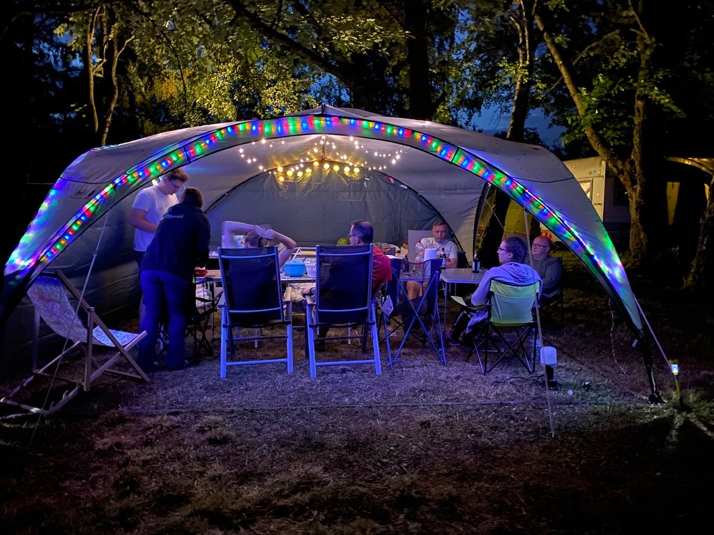 Nach einer reibungslosen Fahrt mit Anhänger und vollgestopften Auto (Danke an Christopher für die Dachbox) kamen wir ohne weitere Vorkommnisse in Landau an. Man hatte uns bereits vor der leicht zu übersehenden Einfahrt zum Flugplatz und den damit verbundenen Gefahren heranschießender Autos von hinten gewarnt (leider kam die Warnung für Renate und ihre ASW20 zu spät. Ein Transporter fuhr ihr hinten in den Anhänger und beging Fahrerflucht. Auto und Flugzeug kaputt, so eine Schweinerei!). Nachdem wir unseren Flieger abgestellt hatten, suchten wir für unser Camp ein schönes Fleckchen aus. Am Rand des „Erwachsenen-Zeltplatzes“ (man versuchte die Junioren ein wenig zu separieren) erwischten wir eine entsprechend große Fläche und begannen mit dem Ausladen. Nach und nach trafen auch unsere Mitcamper ein. Ich drücke es mal so aus: Wir wurden zu einem gut organisierten Chaoscamp! Ausgerüstet mit „Fort Knox“, mehreren Tischen, Kühlboxen und Herdplatten konnten wir den Widrigkeiten des Campalltags trotzen. Allerdings mussten doch noch die ein oder andere Fahrt in den nahegelegenen Baumarkt oder Decathlon gemacht werden. Hier war mal die Kabeltrommel zu kurz, da stellte sich das geliehene Zelt als Hundehütte raus. Wir hatten trotzdem großen Spaß beim Aufbauen und irgendwann stand auch das Lager! Juhu!