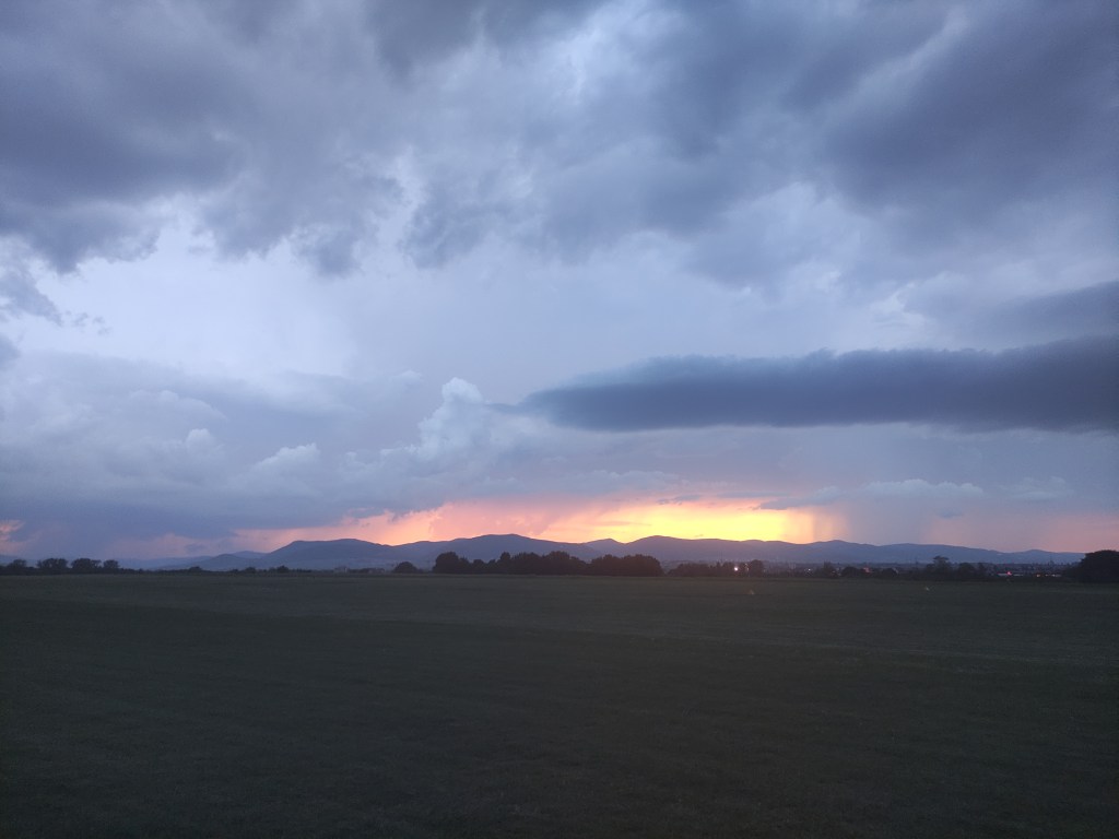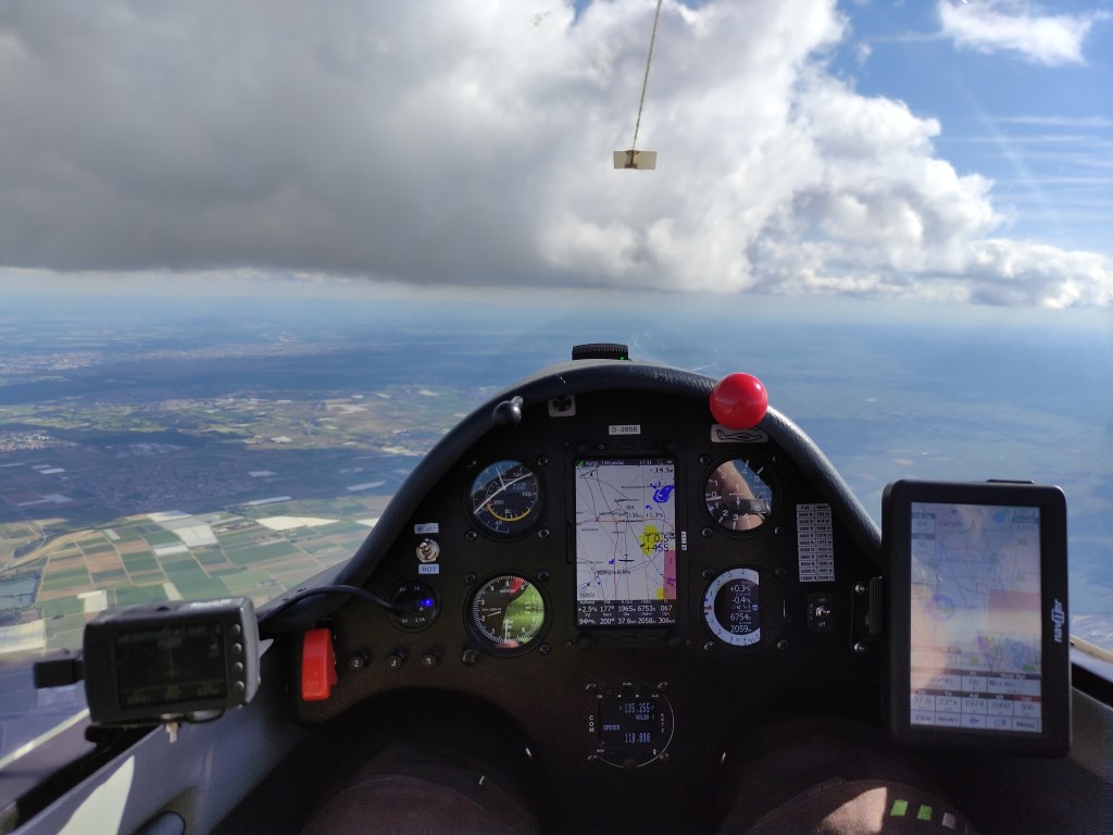 Durch meine Entscheidung blieb mir aber nichts anderes übrig, als unter der Monsterwolke durchzufliegen, da drum herum fliegen einen großen Umweg bedeutet hätte. An der Kante der Wolke traf ich erfreulicherweise noch einen 1,5m/s Bart ein und kletterte so bis unter die Basis. Jetzt aber nichts wie weiter! Es war wirklich sehr dunkel darunter und die Displaybeleuchtung meines Navis war gefühlt die einzige Lichtquelle. Dann fing es auch noch an zu regnen und zu dem stakkatoartigen Geprassel auf meiner Haube kam noch das Vario. Welches piepte! Nicht, dieser demotivierende „Du hast es vermasselt“-Möööööp, sondern ein „Freue dich, denn du hast dieses Mal Glück gehabt“-Piepsen. Ja, ich hatte im strömenden Regen im Geradeausflug 2m/s steigen.