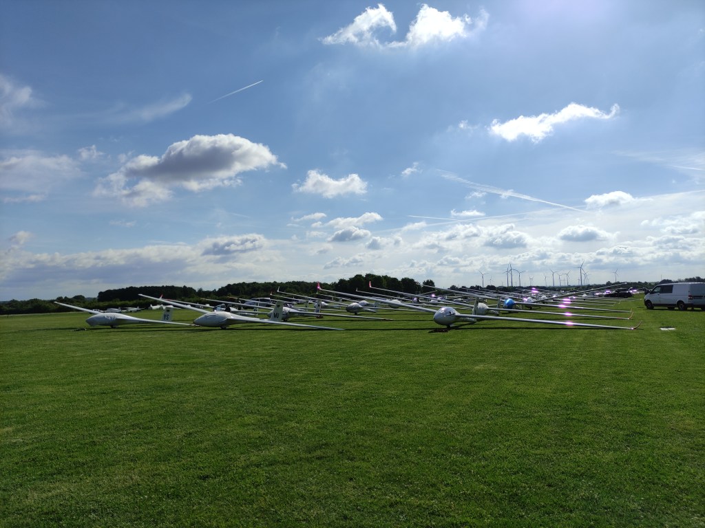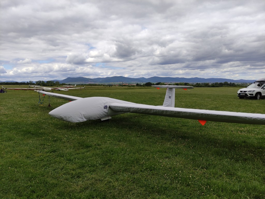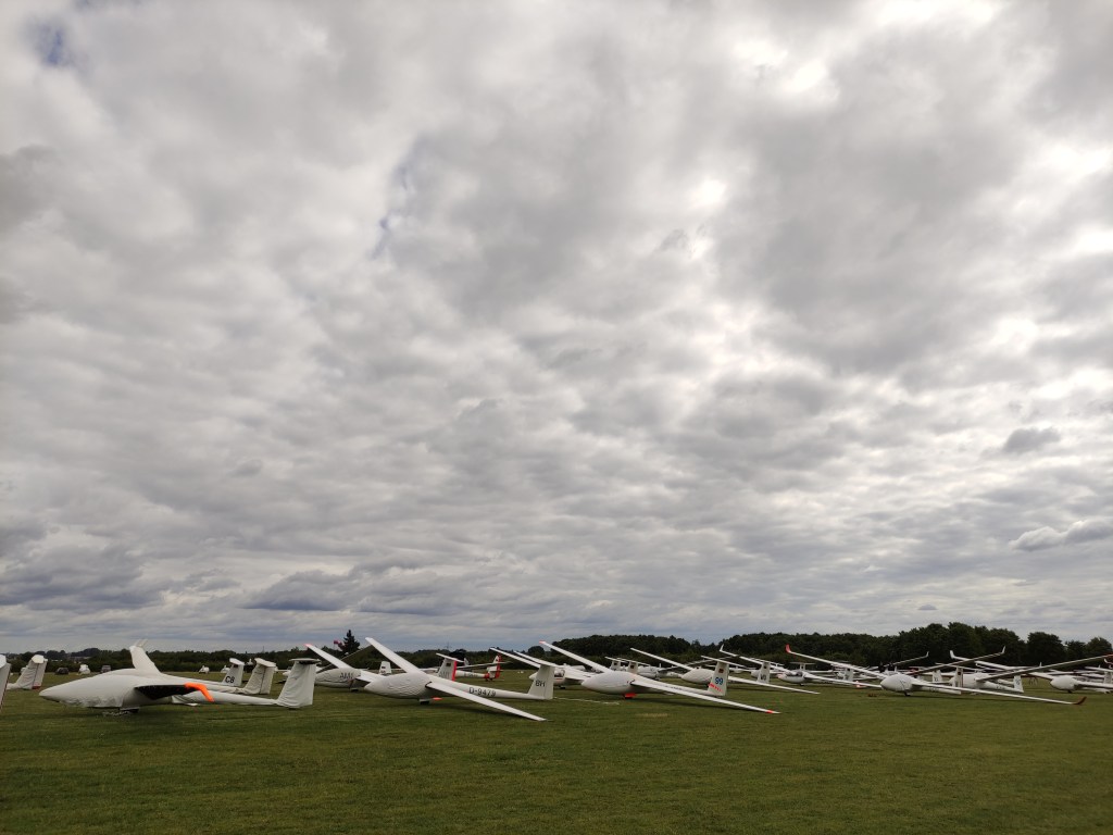 Beim Aufbau des Grids (wir Clubbies standen schon wieder vorne) begrüßte uns der Tag mit einer dichten Bewölkung. Zwar war hier und da Struktur zu erkennen, aber so berauschend sah es nicht aus. Dementsprechend motiviert war ich auch, als ich im Grid auf eine Entscheidung der Wettbewerbsleitung wartete. Zwar lockerte sich nach und nach die Bewölkung auf, aber richtig schön sah es nicht aus. Nach mehreren Verschiebungen der Startbereitschaft wurde der Thermikschnüffler hochgeschickt. Wir verfolgten gespannt seinen Flug übers Internet und lauschten im Funk, was er denn so zu berichten hatte. Der Thermikschnüffler hat leider wenig Thermik erschnüffelt und landete kurze Zeit später auf dem Nachbarflugplatz. Glücklicherweise entschied die Wettbewerbsleitung die Clubklasse zu neutralisieren. Wir hatten also 30 Minuten Zeit unsere Flieger aus dem Weg zu schaffen, was auch in Windeseile geschafft wurde.