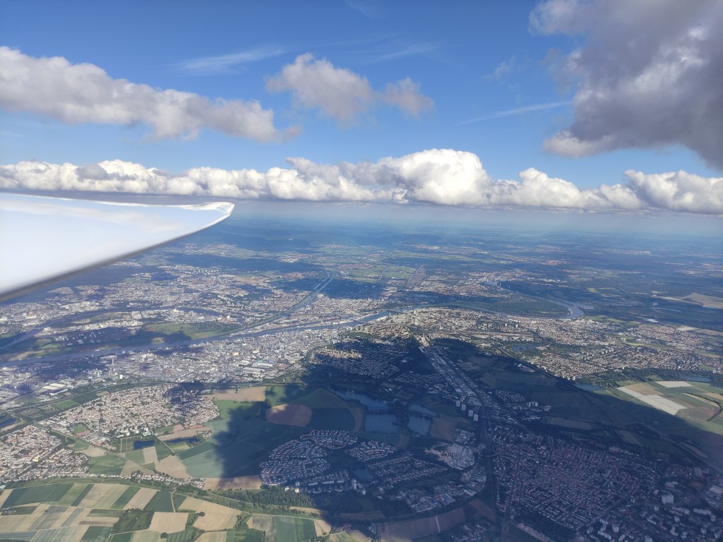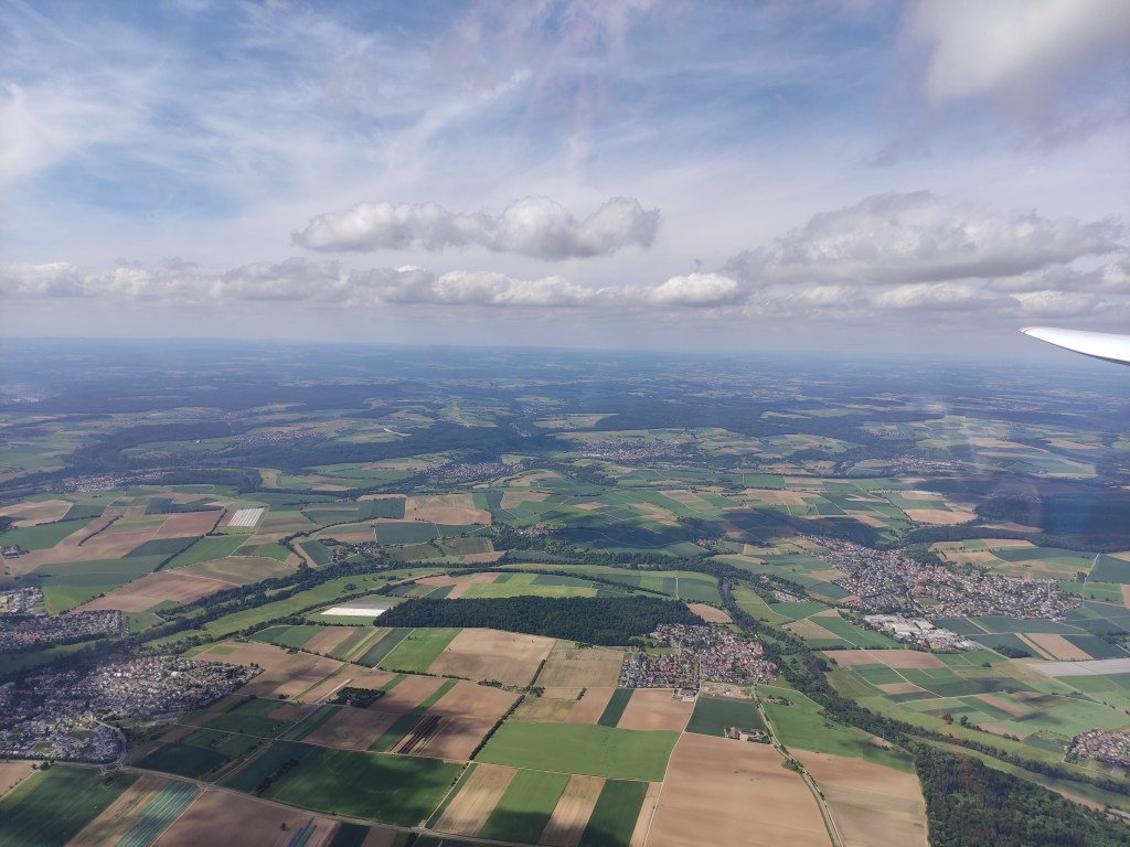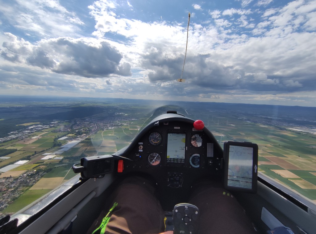 Lange Rede, kurzer Sinn: Das Seil hielt und das Schleppflugzeug warf mich im Ausklinkraum unter einer schönen Wolke heraus. Wir Campmädels trafen uns schnell auf einer Frequenz und besprachen das weitere Vorgehen. Kurze Zeit später war auch schon die Abfluglinie frei und es ging los. Ich flog zusammen mit Anna und Marie in zwei Discus (Discen? Disketten?) ab. Der Teamflug klappte ausgezeichnet und ratzfatz waren wir an der ersten Wende nördlich Mannheim. Leider verloren wir kurz darauf Marie, die sich aber heldenhaft aus 400m wieder nach oben kämpfte. Danach ging es Richtung Osten nach Schwäbisch Hall. Über den Odenwald machten wir unter einer grandiosen Wolkenstraße ordentlich Geschwindigkeit und erhöhten den Schnitt auf einen ansehnlichen Wert. Zwischenzeitlich hatte uns Elena in der Ls4 überholt, die eine noch bessere Linie nach Osten gefunden hatte. Es machte richtig Spaß und ich wähnte mich in trügerischer Sicherheit.