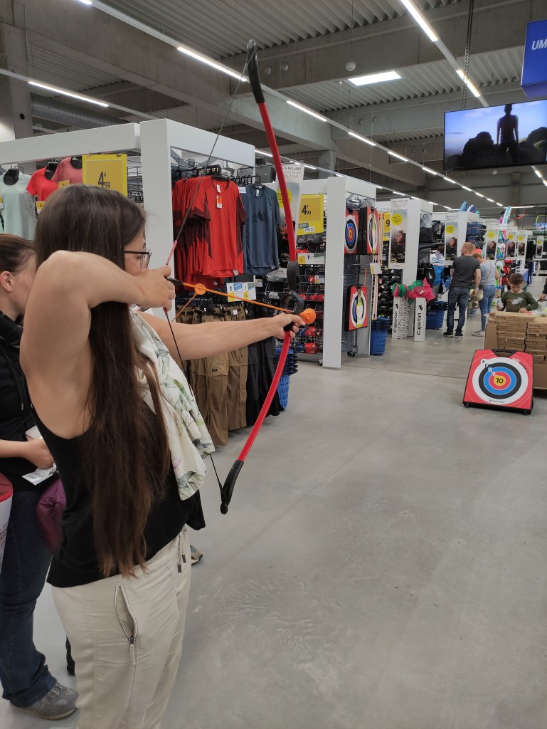 Zuerst probierten wir im Decathlon den Kinderbogen mit Saugnapfpfeil aus und schossen dabei den ein oder anderen Mitarbeiter ab. Es ist leicht eskaliert!