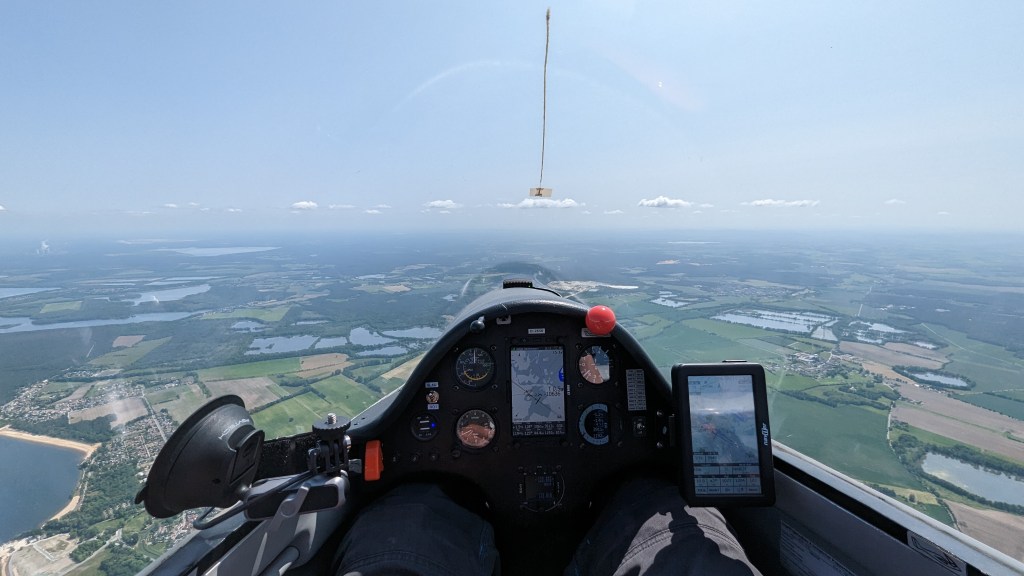 Ich flog die Wolke an und nach ein zwei Suchkreisen fand ich das erste brauchbare Steigen des Tages mit 1-1,5m/s. Im Funk hörte ich nur „Da haste aber nochmal Glück gehabt Mädel!“. In 1100m AGL verabschiedete ich mich und setzte meine Reise nach Südosten fort. Gleiches Spiel in Schwarzheide. Nach dem Ankündigen im Funk und der Frage, ob die Sprungzone aktiv sei, peilte ich das kleine Solarfeld direkt am Flugplatz an. Dieser Bart brachte mich auf 1000m über Grund und während ich kreiste entdeckte ich ein paar Kilometer weiter den Reinsdorfer Duo mit David. Schnell war er auf der Quatschfrequenz gefunden. Zwar zeigten sich inzwischen ein paar Wolken, aber bei Klix war es damit auch erst einmal wieder vorbei. So kämpften wir uns dort noch einmal von 600 auf 1100m und teilten uns wieder auf.