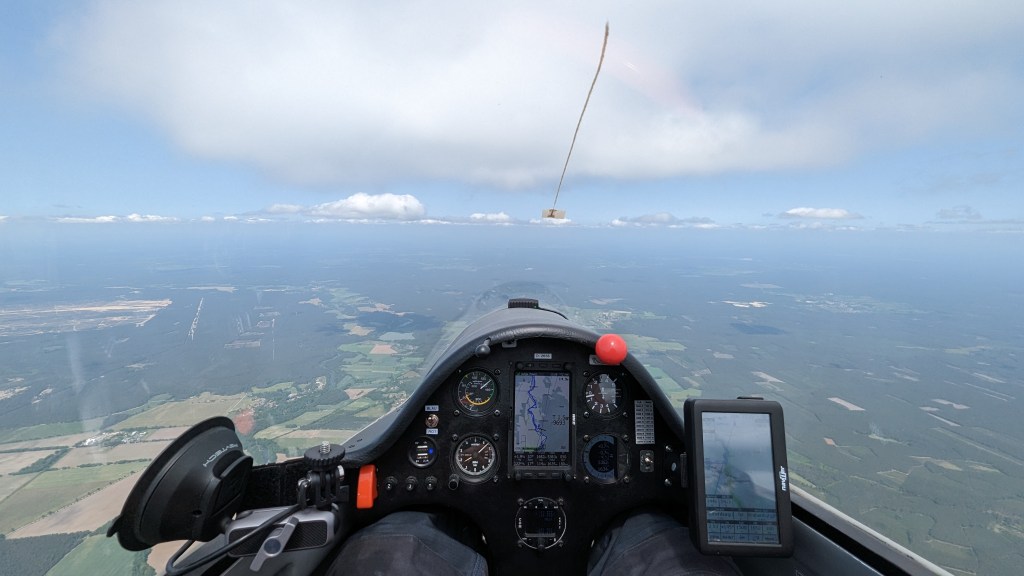Die Profis starteten vor mir. Ich stand relativ entspannt (Es war noch mega früh. An Windenbeginn um 0900 wäre in Friedersdorf gar nicht zu denken) im Grid. Nach kurzer Suche nach einem abgefallenen Vorseil ging es für mich um 10:16 Uhr local los. Nach einigem Suchen fand ich an der Waldkerbe im Westen des Flugplatzes einen brauchbaren Bart. In knapp über 1000m AGL flog ich aus Reinsdorf nach Südosten los. Der Wald trug einigermaßen und ich kam den Umständen entsprechend (480m AGL den zweiten Bart des Tages auskämpfen mit Blick auf meinen Kartoffelacker von der letzten Blauthermik-Aktion) voran. In Blauthermik losfliegen am Morgen ist bei mir eine ganz große Kopfsache… bei Flugplatzhopping (d.h. im Endanflugbereich des zum Kurs nächstgelegenen Flugplatzes) bin ich immer viel entspannter. Der erste zu erreichende Flugplatz war Finsterwalde. Ich hatte knappe 300m AGL Endanflughöhe und in Bahnverlängerung stand über der Grube der erste Fetzen, der annäherungsweise an eine Wolke erinnern konnte. Ich kündigte mich bereits im Funk an, damit die Kollegen schon einmal wussten, wer sich gleich in der Platzrunde aufhalten würde. Locker erklärte ich, dass ich eventuell landen müsste, wenn der Fetzen nicht ziehen würde.