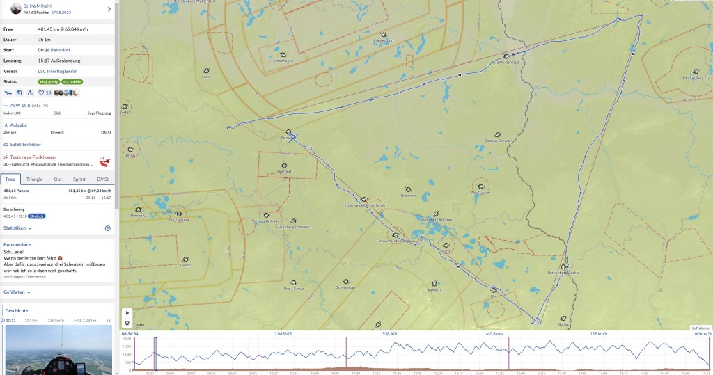 Davids Wende war Rothenburg, ich musste noch ein wenig weiter südlich nach Reichenbach… im Blauen. Abbrechen war keine Option und so stürzte ich mich todesmutig Richtung Wende. Und es ging… ganz beschissen. Am schönen Städtchen Reichenbach standen einige Windräder, die ich anpeilte und konnte so meinen Flug von 500 auf 750m verlängern. Da das zaghafte Steigen nun auch verschwand entschied ich mich einfach weiterzufliegen. Ab durch die Wende und dann wieder nach Norden. Die Höhe schwand und ich befasste mich schon einmal mit der Landesituation. Sicher ist sicher, aber kampflos würde ich mich nicht geschlagen geben. Bei 490m flog ich eine Waldkante ab und vorsichtig hob sich eine Fläche. Das Vario schlug auch sachte aus und ich kreiste links herum ein. Ein halber Meter, zerrupft, aber brauchbar und ich entschied mich erst einmal drin zu bleiben. Nach einer gefühlten Ewigkeit war ich wieder auf 900m und ich setzte meine Reise durchs Blaue fort und es ging… gar nix. Ich erkannte, dass Rothenburg genau auf Kurs lag und mein Endanflugrechner meinte, dass es gerade noch reichen könnte. Na immerhin. Ich wählte einen leichten Schlenker über ein Solarfeld und konnte mich von 650m auf 1100m hochkreisen. Endlich konnte ich wieder die Wolken (Die Deutsch-Polnische Grenze war auch die Wettergrenze. Über Polen sah es erstaunlich gut aus) erreichen und peilte die erste fluffige direkt am Flugplatz an. An der Südseite der Wolke kreiste ich ein, konnte aber das Steigen nicht richtig zentrieren. Nach ein paar Kreisen flog ich entnervt weiter, aber keine 50m später gab es einen gewaltigen Rumms von unten und ich stieß mir erst einmal den Kopf. Vario auf Anschlag und ich machte fast eine Rolle. Ich kreiste entsprechend ein. Mit 3m/s ging es nach bester Fahrstuhlmanier nach oben und über die 1600m AGL Arbeitshöhe freute ich mich sehr.