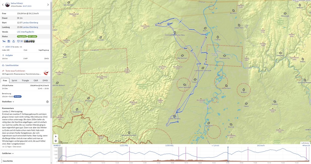 Der nächste Fetzen lag wieder im schönen Wetter und durch das wieder abfallende Gelände hatte ich ein wenig mehr Suchradius. Glücklicherweise zog dieser dann auch direkt mit 1,5m/s und während ich kreiste, pustete mich der Wind in die Wende hinein. Ich hatte viel Zeit am Dönerberg gelassen und wollte nach der kräftezehrenden Rettungsaktion nur noch nach Hause. Ich ließ mich weiter in den Kreis hineintreiben und nördlich von Mannheim kletterte ich auf entspannte 1600m AGL. Inzwischen war ich also wieder im guten Wetter angekommen und hatte noch gute 50km auf Landau. Einen Bart unterwegs würde ich mit dem strammen Seitenwind also noch brauchen. Ich flog wieder Richtung Süden und bei Dannstadt stand die nächste Wolke. Zwar war das dortige Steigen anfangs nicht ganz so stark wie erwartet, aber ich wollte einfach nur nach Hause kommen. Je höher ich aber kam, desto besser wurde es und weil es so schön war, gönnte ich mir noch einmal Basishöhe. Mit fast 1800m AGL hatte ich ordentlich Reserve auf meine Endanflughöhe und könnte, wenn es gut lief, die überschüssige Höhe ja noch in Fahrt umwandeln. Also los. Zwar gab es unterwegs wieder starke Sinkstrecken, aber ich konnte meine Höhe optimal einteilen und kam entspannt am Zielkreis an. Zwar wieder viel zu hoch, aber nach diesem Flug war mir das herzlichst egal. Die Stimmung nach der Landung war ausgelassen, haben doch alle im Camp an der zweiten Wende mitgefiebert. Zwar war ich an diesem Tag die zweitlangsamste von den Rumkommern, aber da die Hälfte der Klasse außengelandet ist, konnte ich mich auf den 3. Gesamtplatz verbessern. Yay!