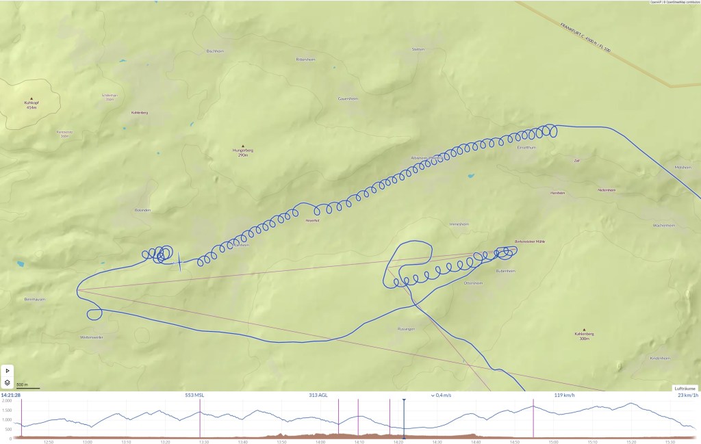 Der starke Wind machte mir in meiner leichten ASW19 sehr zu schaffen und nach über einer Stunde Kämpfen am Platz (ich kam kein einziges Mal über 700m) musste ich landen. So kam ich wenigstens in den Genuss, auch einmal von Domi in der roten Breezer geschleppt zu werden. Ich brauchte auch jetzt fast eine Stunde, bis ich auf einer sinnvollen Abflughöhe war. Die Clubklasse war schon längst am Odenwald angekommen, hatten diese bei ihrem Streckenstart noch eine schöne Wolkenstraße nach Osten. Ich bekam leider davon nur noch die Reste ab und flog mutig los. Leider traf ich eine ganz beschissene Linie und meine Abflughöhe war schnell dahin. Es blieb mir nichts Anderes übrig, als in 550m das erstbeste Steigen mitzunehmen. Trotz den 40km/h Rückenwind, wäre ich nie bis zur nächsten Wolke gekommen und so buddelte ich mich südlich von Philippsburg aus. Nachdem ich mühevoll 500m erkämpft hatte, wagte ich den Sprung zur nächsten Wolke. So schlecht wie es unter der Wolke stieg, so brutal ging es jetzt abwärts. Und so war ich wieder in der Situation, mich aus 500m mangels Alternativen mit schlechtem Steigen auszugraben. Die ersten aus der Clubklasse tauchten wieder im Flarm auf, sie hatten die ersten beiden Wenden schon genommen und peilten anscheinend schon den letzten Sektor an. Meine Laune war in der Zwischenzeit im Keller angekommen und ich versuchte irgendwie genug Höhe zu sammeln, um in einer (für mich) Wohlfühlhöhe am Odenwald anzukommen. Über der Kante stand eine Wolkenstraße nach Norden (man beachte: wir hatten Wind aus Westen) und versprach eigentlich dort gute Bedingungen. Zwar war auch das Gelände am Odenwald sehr hoch, aber eigentlich mag ich die Gegend sehr gern und falls man es nicht mehr ins Rheintal schaffen sollte, gibt es (im Gegensatz zum Pfälzer Wald) auch oben drauf gute Landemöglichkeiten. So improvisierte ich mich mehr schlecht als recht nach Norden und flog meist auf 500m über der Hangkante. Unter mit kamen mir einige Flugzeuge direkt am Hang entgegen, aber ohne Hangflugerfahrung hatte ich da riesen Respekt davor. Ich flog Wolke um Wolke an, aber es ging irgendwie nicht richtig. Meine Laune sank zusammen mit meiner Höhe zunehmens und meine Nerven lagen blank. Und während ich in meiner Not jammernd zu Vicky sprach „Wo sind wir da nur reingeraten?“ und ziemlich planlos nach Norden flog, stolperte ich auf einmal genau über dem Königsstuhl in Steigen. Und was für welches. Während ich in einem 3m/s Bart wieder Höhe machte, sah ich mir den Weg zur zweiten Wende noch einmal genauer an. Tatsächlich stand die Wolkenstraße noch immer über der Kante und wenn diese, besser ziehen sollte als das Rheintal, würde ich auch gut zur nächsten Wende kommen. In 1000m AGL (1500m MSL, der Odenwald war an dieser Stelle 500m hoch) setzte ich meine Reise nach Norden fort. Nach einigem Ausprobieren fand ich sogar eine halbwegs tragende Linie. Den nächsten Wendekreis klatschte ich trotz der guten Optik nur an, da aus Westen ein großer Schauer heranzog und schleunigst das Weite suchen wollte, bevor er mich am Hang hinunterspülen konnte. Ich sammelte auf dem Rückweg noch einmal 250 Höhenmeter und wagte den Sprung zurück zum Königsstuhl, in der Hoffnung, dass mich dort wieder gutes Steigen erwarten würde. Leider fand ich trotz einigen Suchkreisen den Bart nicht und entschied mich weiter zu fliegen. Leider war dann auch schon die Wolkenstraße zu Ende und mir blieb nichts weiter übrig, als die nächste Wolke wieder im Rheintal anzusteuern. Aber dieses Mal hatte ich noch einmal Glück und traf den zweiten guten Bart des Tages. Mit über 2m/s stieg ich von 650 auf 1300m und war eigentlich recht zuversichtlich es nach Hause zu schaffen. Zwar waren es noch 50km nach Landau mit inzwischen 50km/h Gegenwind, aber auf Kurs lagen einige Wolken. Irgendeine wird ja schon ziehen. Und so nahm das Drama seinen Lauf. So gut wie es nach oben ging, ging es dann auch runter und aus meinen 1300m AGL waren nur noch 1000m geworden, kaum dass ich weiter als meine vorherige Einkreisestelle gekommen war. Die nächste Wolke zog wieder ganz im Zeichen der Rheintalwolken des heutigen Tages…und zwar so gut wie gar nicht. Haben mich das bisschen Steigen auf dem ersten Schenkel dank des Rückenwindes noch zur Wende geblasen, so wurde mit dem aktuellen starken Gegenwind meine noch zu erkurbelnde Endanflughöhe immer größer, obwohl ich mit einem halben Meter stieg. Nach 100m erkannte ich die Sinnlosigkeit und flog mutig zum nächsten Fetzen, aber dort erwartete mich das gleiche Spiel wie eben. So flog ich Fetzen um Fetzen ab, ohne signifikant weiter zu kommen. Zwar fand ich ein Stückchen weiter immerhin einen Meter, aber der Gegenwind pustete mich weiterhin gnadenlos in die falsche Richtung. Ein Plan musste her! Waren die letzten Wolken eher Fetzen und Flusen gewesen, erkannte ich, dass bei Philippsburg die nächste Wolke mit schöner Optik stand. Dort sah ich auch meinen Saarländischen Kollegen Markus in der ER kreisen und zwar gar nicht übel. Allerdings kreiste er im Südwesten des Sperrgebietes, was bedeutet, dass ich es erst einmal darüber schaffen müsste. Das sollte ja irgendwie machbar sein, da ich als ich weiterflog gute 1050m AGL (1170m MSL) hatte und das ED-R „nur“ 701m MSL. Ich sollte also eigentlich locker drüber kommen und Anschluss an der besagten Wolke finden. Theoretisch! Je näher ich Philippsburg kam, desto größer wurde das Sinken und ich konnte meinem Höhenmesser dabei zuschauen, wie sich die Zeiger rückwärts drehten. Verdammt. Ich erkannte, dass ich gnadenlos ins ED-R reinsemmeln würde und bog kurz davor zwangsweise wieder nach Norden ab (750m MSL, 650m AGL, Gleitzahl seit dem letzten Steigen 13). Aufgrund fehlender Alternativen nahm ich Kurs auf die nächsten Fetzen, aber diese brachten mir gar nichts, außer noch mehr Sinken. Ich war einfach chancenlos. Aufgrund der inzwischen schon niedrigstehenden Sonne, konnte ich leider die kommenden Felder nicht