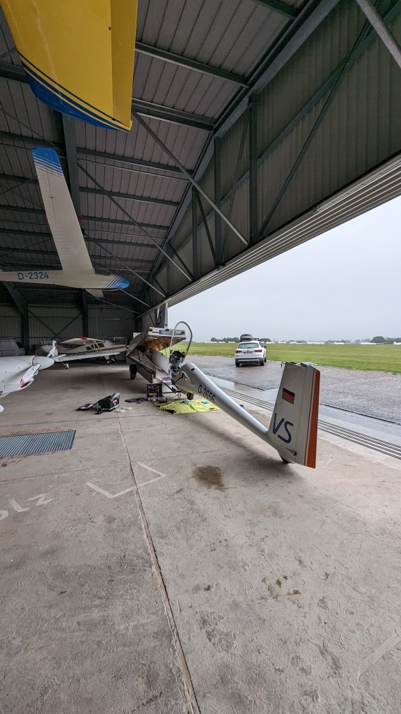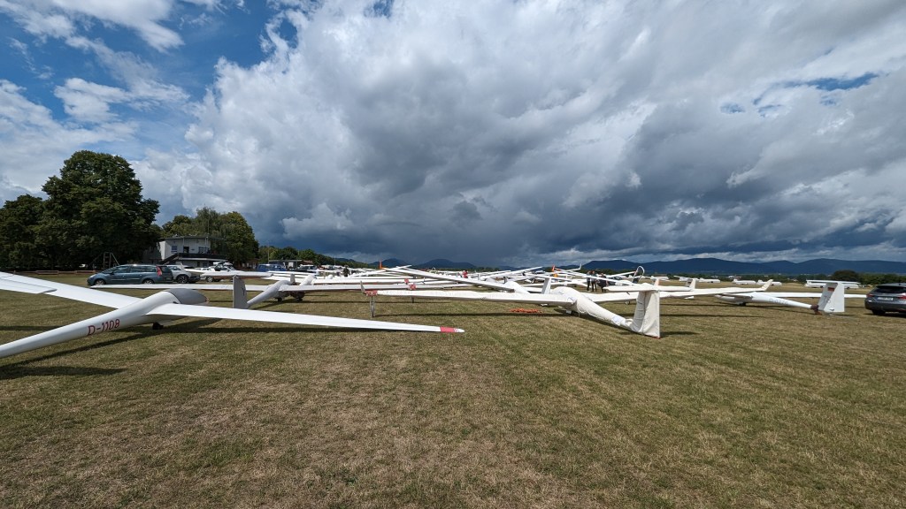 Nach der Landung wurde klar, dass niemand die Aufgabe geschafft hatte (weder Club- noch 15m-Klasse) und ich mit meiner Außenlandung in Speyer den 4. Tagesplatz hatte. Was für ein beklopptes Wetter!
