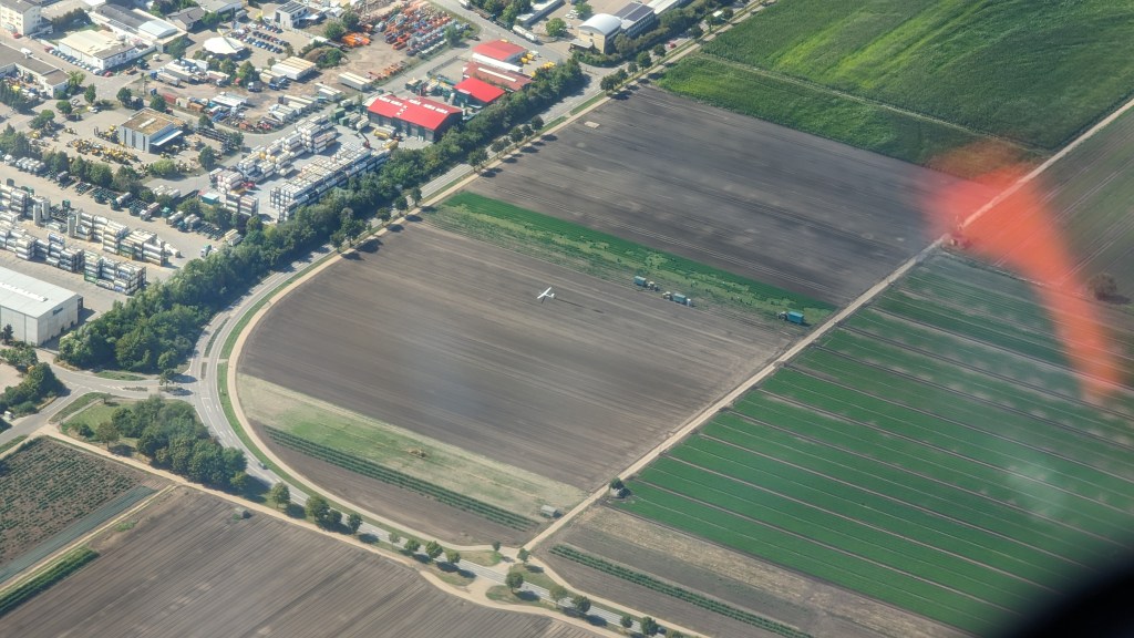 Unter mir bretterten einige waghalsige Piloten direkt an der 1. Gräte entlang, aber ich fühlte mich in ausreichender Höhe eigentlich ganz wohl. Einen weiteren Vorteil hatte aber die Odenwaldkante: Es lösten sich hier wirklich gute Bärte aus. Östlich von Ladenburg fand ich einen ordentlichen Bart, der mich über der Hangkante auf 750m AGL brachte (zog man die Geländehöhe von ungefähr 400m ab, reichte es, um wieder einiges an Spielraum zu gewinnen). Bei Heidelberg ging es dann wieder ins Rheintal, allerdings erkannte man schon von weitem, dass das Wetter nicht besser werden würde. Über der Wende stand ein großer Schauer und die ersten Außenlandemeldungen gingen ein. So nahm ich Geschwindigkeit raus (was ich halt so Geschwindigkeit nenne) und entschied mich, so gut es möglich war jedes nutzbare Steigen mitzunehmen. In der Zwischenzeit hatte sich die gefühlte halbe Clubklasse bei Hockenheim eingefunden. Marie in der LS4 hatte seit der ersten Wende mehr Glück als ich und berichtete von sehr gutem Steigen an der Basis. Allerdings war sie auch 300m über mir. Moritz (ebenfalls in einer LS4) kämpfte auf meiner Höhe, aber wir konnten leider das besagte gute Steigen nicht bestätigen. Die Bärte waren inzwischen alle aufgrund des zunehmenden Windes sehr zerrissen. Wo auf der einen Seite 2m/s standen, war auf der anderen Seite Sinken. Mit den 1000m AGL in von Hockenheim wagten wir den Sprung nach Süden zur letzten Wolke vor dem Schauer. Jetzt ging es wirklich nur noch ums oben bleiben. Die Wolke brachte uns auf 1200m AGL. Da ich wieder etwas tiefer eingestiegen bin, flogen die anderen ein paar Kreise vor mir ab (Moritz berichtete freundlicherweise im Funk, wie das Wetter an der Wende war…bescheiden). Bereits von weitem erkannte man, dass es aus der großen Flatschenwolke genau über der Wende regnete. Auch mir prasselten schon die ersten Regentropfen auf die Haube und nachdem ich die Wende erreicht hatte, drehte ich um und flog wieder ins Trockene. Aber selbst nachdem ich die Wolke hinter mir ließ, zeigte mein Variometer konstantes Sinken an. Klassische Tote Luft bei einem Schauer. Ich wägte meine Optionen ab und entschied mich auf Kurs weiterzufliegen, denn das bedeutete auch den direkten Weg zum Flugplatz Speyer. Ich drehte die Frequenz ein und meldete mich bereits im Funk. Zwar standen über dem Flugplatz zwei kleine Fetzen, aber falls diese nichts bringen sollten, hatte ich eine sichere Landemöglichkeit. Es kam wie es kommen musste, die Fetzen zogen nicht! Ich flog im Gegenanflug noch einmal die Industrieanlage im Osten der Bahn ab, aber auch da erwartete mich nur tote Luft.