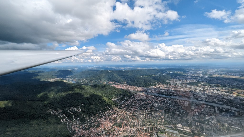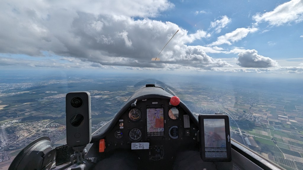 Nach einigen Suchkreisen entschied auch ich mich weiter zu fliegen, allerdings um unter der Wolke noch weiter zu suchen. Am Ende der Wolke standen dann zum Glück anderthalb Meter, die wir dankbar mitnahmen. Leider war in 750m AGL das Steigen zu Ende, aber die nächste Wolke östlich von Bad Dürkheim sah vielversprechend aus. So wagte ich den Sprung und kam erneut in ungefähr 450m AGL an (wer sich wundert, warum ich schon so viele graue Haare habe…deswegen). Leider brachte die Wolke nicht das gewünschte Steigen, aber mir blieb in der Höhe nichts Anderes übrig, als mich an durchschnittlich 1m/s festzubeißen. Auch hier ging es in 750m AGL weiter zur nächsten Wolke ein Stück nordöstlich. Endlich war hatte ich die Kontrollzone Mannheim passiert und konnte nun direkt zur Wende abbiegen (Mannheim ist 610m hoch. Klingt prinzipiell nach nicht viel…wenn das Wetter mitspielt). Südlich von Worms querte ich den Rhein und flog zum ehemaligen Flugplatz Coleman bei Sandhofen. Die Idee war nicht schlecht, denn der trockene und sandige Boden bescherte mir einen 2m/s Bart, der mir 500 Höhenmeter einbrachte. So konnte ich den Sprung nach Norden zur ersten Wende bei Bensheim wagen. Ich sag dort bereits ein paar Clubklasseflugzeuge kreisen und peilte die Bojen an. Also nix wie hin, gewendet und unten in den Bart einsteigen. Von nun an ging es erst einmal wieder nach Süden zur zweiten Wende. Da man nun an der Odenwaldkante entlangfliegen konnte, suchte ich mir eine halbwegs tragende Linie (Die Aussage der Sportleitung „Bei dem Wind, könnt ihr dann schön Hangflug machen!“) auf Flachland-Pilotinnen-kompatibler Höhe.