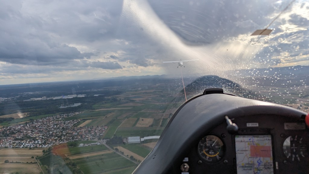Für den komfortablen Rückschlepp musste allerdings meine kleine Vicky ans andere Ende des Platzes gezogen werden. Kein Problem, dachten wir uns. Der nette Fahrer des Lepos klinkte mich ein und so rollten wir langsam über den Taxiway zum Beginn der Startbahn. Ich dachte mir nichts dabei, bis ich feststellte, dass irgendwas ein wenig verkokelt roch. Ich suchte die Quelle des Kokelgeruchs und erkannte, dass mein Flugzeug qualmte. Besser gesagt mein Schleifsporn. Ich bat (besser gesagt schrie), dass das Auto kurz anhalten sollte und mit einem „Shitshitshitshit!“ rannte ich zu meinem Cockpit, schnappte mir meinen Trinksack und eilte zum Heck meines Flugzeuges, um dieses zu löschen (auf einmal ergeben die Urban Legends Sinn, bei denen jemand die brennende Foka-Kufe nach einer Landung auf Asphalt ausgepullert hatte). Nach kurzer Untersuchung war klar: Die Schleifplatte aus Metall hat sich durch die Reibung erhitzt (soweit logisch) und brachte den Sporn aus Hartgummi zum Schmelzen. Nach der kleinen Löschaktion zogen wir Vicky das restliche Stück über das Gras zum Start. In der Zwischenzeit war mein Taxi in Form der FK9 gelandet und wartete auf mich. Blöderweise hatte es schon wieder zu regnen angefangen und ich bereitete mich auf die Premiere vor, denn das war das erste Mal, dass ich mir einen Heimschlepp gönnte. Mein Schlepppilot versicherte mir, dass wir trotz Regens starten könnten und während ich mich abflugbereit machte, wurde mein Flugzeug von den Einheimischen noch einmal abgeledert. Den Start an sich musste ich mehr oder weniger blind machen, da ich aufgrund des Regens die ersten Meter nichts sah. Auch gab ich mir die größtmögliche Mühe meinen Sporn zu entlasten, um zu verhindern, dass ich zur fliegenden Fackel wurde (wahrscheinlich etwas übertrieben). Der Rückschlepp war trotz Regens sehr ruhig und bald war ich wieder in Landau.