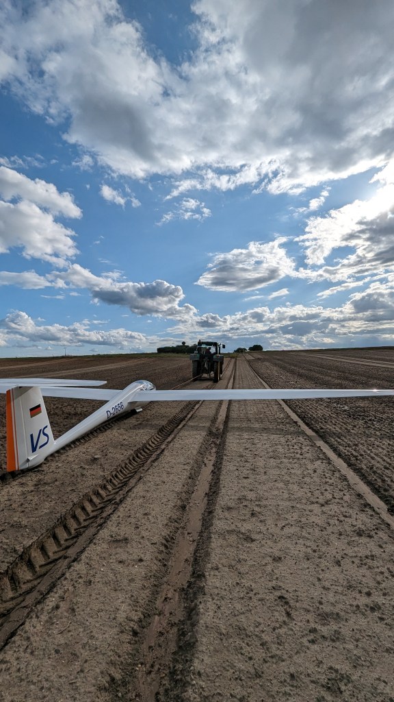 Während ich Steffen kontaktierte ging ich zu den nahegelegenen Häusern in der Hoffnung jemanden mit Traktor zu finden (mit unserem Auto wäre es unmöglich gewesen den Flieger aus dem weichen Acker zu ziehen), fand aber niemanden. Auf dem Rückweg kamen mir zwei Fahrradfahrer entgegnen, die mir weiterhelfen konnten. Einer hatte die Nummer vom Bauern am anderen Ende des Dorfes, dieser machte sich auch sogleich samt Traktor auf den Weg, um mich aus meiner misslichen Lage zu befreien. So konnte meine tapfere Vicky zum Feldrand gezogen werden und der Bauer half noch beim Abrüsten (bei dem starken Wind und den damit zusammenhängenden Böen, wollte ich mich nicht nur auf meine Flächenstütze verlassen).