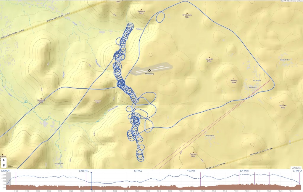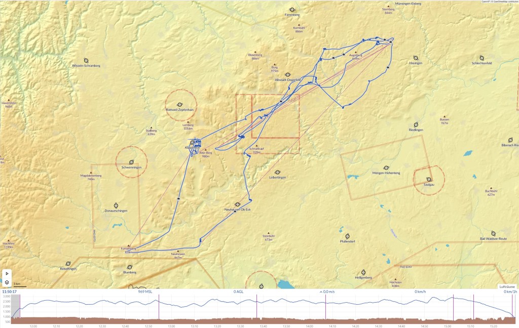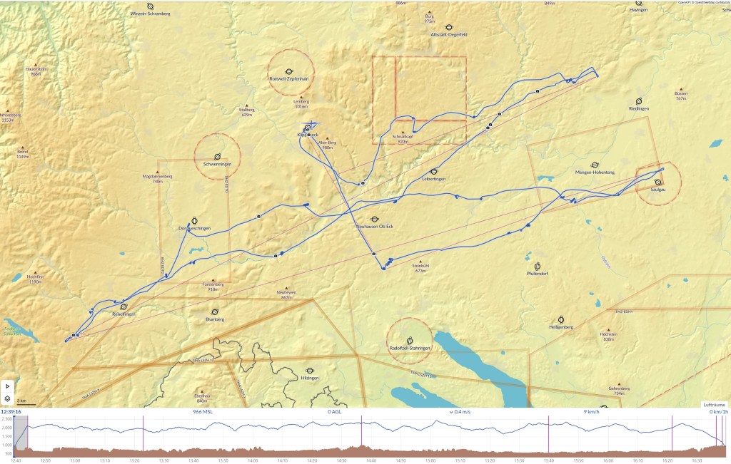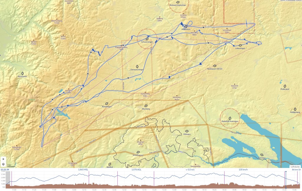 Wir flogen von unserer Wende bis kurz vor Neuhausen ohne einen Kreis und kamen sogar 200m Höher raus, als beim Einstieg. Weiter ging es bis Donaueschingen, wo wir noch einmal Höhe sammelten (2300m MSL, was an der Stelle ungefähr 1600m AGL waren) und nach Südwesten Richtung Reiselfingen abbogen. Die Wolken führten uns bis kurz in den Schwarzwald zum Schluchsee.