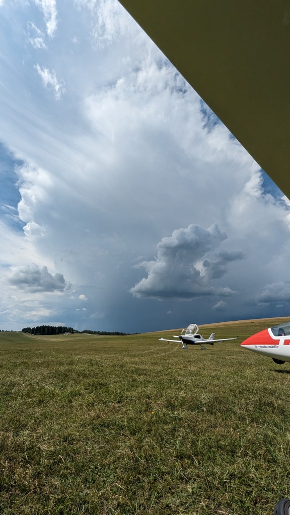 Die Gruppen wurden beibehalten und so zogen wir erneut die Flugzeuge zum Start auf der Bahn 23. Heute klappte das Gridden schon bei weitem besser und schnell waren wir startbereit. Nunja, wir waren startbereit, aber das Wetter eher nicht. Als sich dann endlich ein kleines Wetterfenster zeigte wurden die ersten beiden Gruppen geschleppt. Gruppe 1 mit Walter und Tanja im AMF Janus, Jasmin in ihrer DG100 und Stephanie mit der LS4. Leider brachte das vorbeiziehende Gewitter auch eine beachtliche Böenwalze mit, sodass die arme Stephanie ganz schön durchgeschüttelt wurde (aber sie machte das trotz widriger Wetterumstände toll). Danach warteten wir erst einmal den Durchzug ab, aber es blieb bockig. Einige Zeit später wagte Veit mit Susanne im Duo Discus den Start und bekamen auch wohl den letzten Thermikpups am Platz ab.