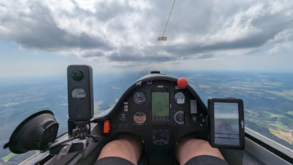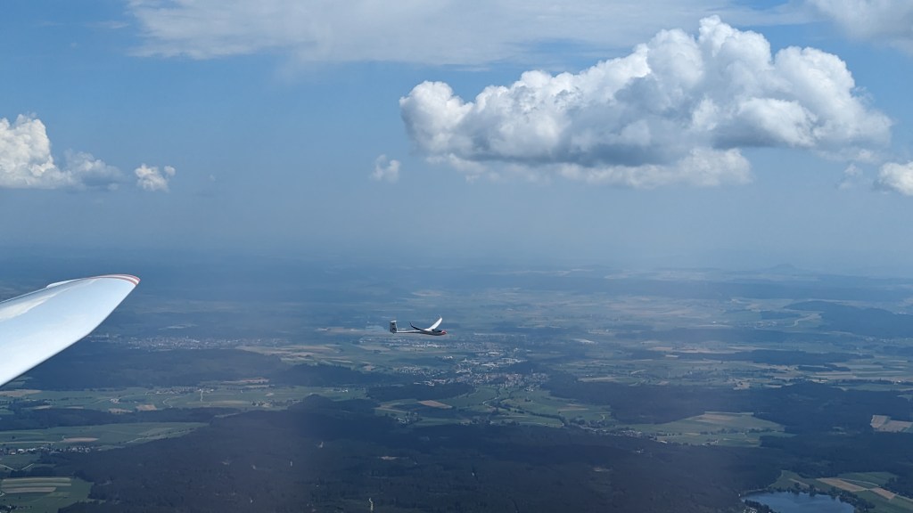 Auch auf den Rückweg ging es unter eine Wolkenstraße und auch diese trug fantastisch, sodass es erst wieder südlich von Donaueschingen notwendig war zu kreisen. Leider hatte ich irgendwie immer die Tendenz die Wolkenstraße zu weit mittig anzufliegen, aber ich wurde jedes Mal freundlich zur optimalen Linie gelotst. Was soll ich sagen? Ich hab noch nie so wenig gekreist in meinem Leben. So ging es weiter bis zu Flugplatz Saulgau, wo leider wieder die Wolkenstraße endete. Wir wendeten ein zweites Mal im Osten und flogen wieder nach Westen. Leider hat sich die große Wolke unter der wir auf dem Hinweg noch tolles Steigen hatten, zwischenzeitlich zur CB Wolke verwandelt, aus der es allem Anschein nach hier und da bereits regnete. Aber auch das war kein Problem und so suchten wir uns die Wolkenkante aus, die noch in der Sonne lag und flogen weiter. Mit 1500m AGL kam ich ja schon weit und eine 31 noch viel weiter. Bei dem großen Gleitpfad merkte man aber endgültig die Unterschiede und am Ende der Wolke war er gute 200m über mir.