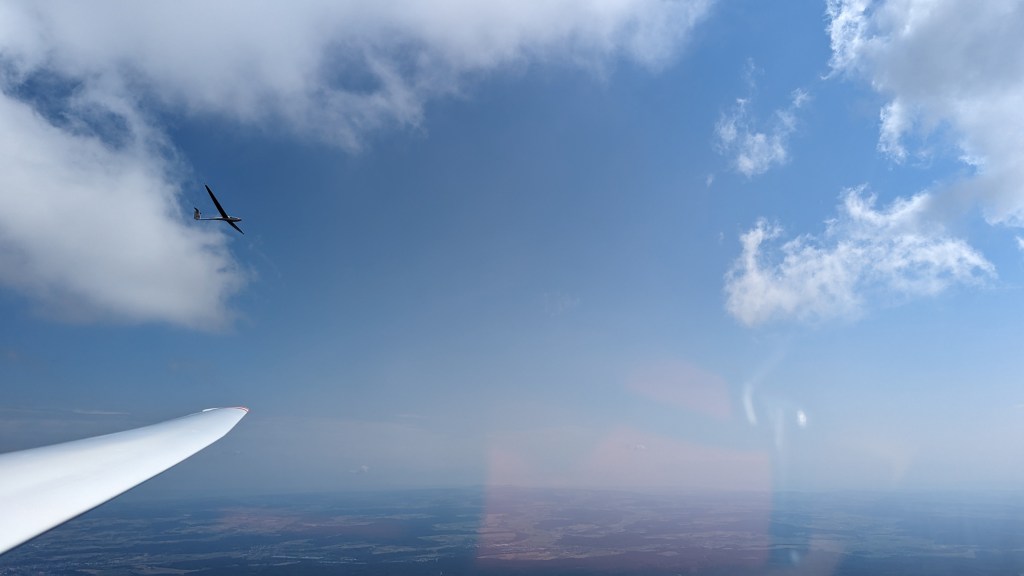 Ich war wieder beim morgendlichen Ausarbeiten des Wetters dabei und die Vorhersage sprach heute von schlechter Blauthermik und einer heranziehenden Abschirmung. Da aber für den Tag zuvor von guter Blauthermik gesprochen wurde, die wir ja nicht bekommen hatten, gaben wir nichts darauf und probierten es trotzdem (oder gerade deswegen). Heute wurden noch einmal die Gruppen gewechselt und ich durfte mit Steffen Weniger zusammen fliegen. Da er mit einer Libelle unterwegs war, sollten wir eigentlich ganz gut zusammenpassen. Aufgrund der hohen Temperaturen ging es erst spät los und ich gönnte mir zuvor eine Runde Kunstflug mit Michael in der DG1000. Danach verteilten wir uns wieder unter diversen Flächen und wechselten langsam den Aggregatzustand. Als die ersten Wolken im Osten meldeten gab es kein Halten mehr und die ersten Schnupperer wurden geschleppt. Steffen und ich waren die letzte Gruppe und hatten Zeit das Treiben auf dem Glidertracker zu verfolgen. Tatsächlich berichteten sie von sehr gutem Steigen. Auch im Blauen!