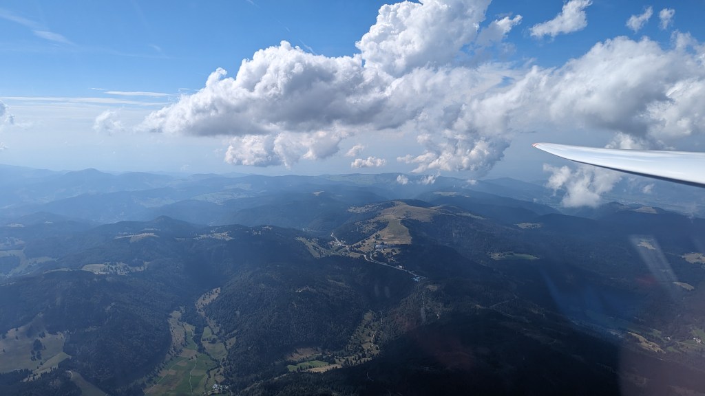 Bei mir stieg es glücklicherweise dort auch, wenn auch nicht so gut wie 100m über mir. Während ich meine Höhe wieder erarbeitete analysierten wir die Umgebung. Die Sonne stand im Süden und mit dem leichten Wind aus gleicher Richtung, war die Hangkante eine gute Ablösekante. Langsam fangen Mittelgebirge an auch in meinem Flachland-Pilotinnen-Universum Sinn zu ergeben. Nach einiger Zeit und erneutem Einsatz von Jürgens Bremsklappen hatten wir wieder die beachtliche Höhe von 1300m über dem Schwarzwald (ungefähr 2300m MSL) und folgten der Wolkenstraße weiter nach Südwesten am Feldberg entlang. Der Feldberg ist mit 1493m der höchste Berg im Schwarzwald (Zum Vergleich: Der Brocken im Harz ist „nur“ 1141m hoch). Der Schwarzwald ist auch das höchste deutsche Mittelgebirge.