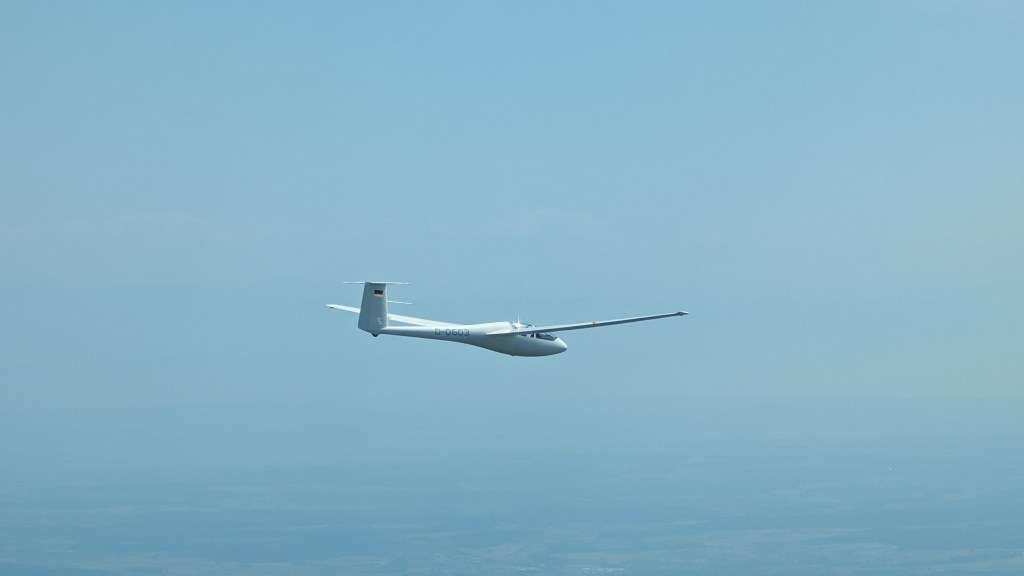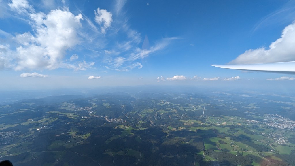 Über Rottweil und Schwenningen ging es wieder zum Schwarzwald. Der erste Bart dort brachte mich auf 1500m über Gelände, Jürgen mal wieder 100m höher (…wie kann so ein großes Flugzeug nur so dermaßen gut steigen?) und ich machte mal wieder Bekanntschaft mit seinen Bremsklappen. Eigentlich war ich groggy und wollte nach Hause, aber da standen doch noch ein paar nette Wolken, die es abzufliegen und den Schwarzwald zu erkunden galt. Heute konnte man weit nach Westen schauen. Westlich des Schwarzwaldes kam erst einmal wieder ein Tal und am Horizont konnte man die Vogesen erkennen (welche dann im Norden zum Pfälzer Wald werden… auch dieses Wissen gab es bei Rainers Erdkundestunde). Unter der Wolkenstraße ging es wieder einmal herrlich und kreislos flogen wir bis zum Titisee (Das rückwärts-pubertierende Ich lacht sich immernoch darüber kaputt. Fast so wie über den FIKI-Test auf Arbeit) und wieder zurück. Balsam für die Seele 30 Minuten ohne einen Kreis über den Schwarzwald zu fliegen. Leider trocknete es inzwischen schon gut ab und so ging es zurück nach Hause.