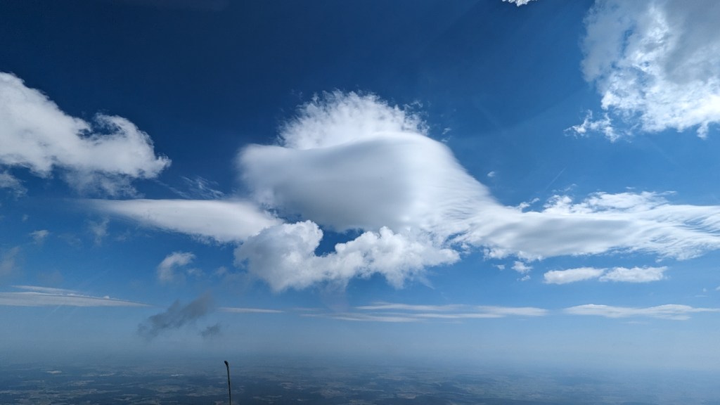 An der letzten Wolke erkurbelten wir 1800m AGL (und das auf der Alb). Etwas weiter südlich stand eine Cumulus-Lenti-Hybrid-irgendwas-Wolke und Steffen wollte mal ausprobieren, ob man da eine kleine Welle trifft.
