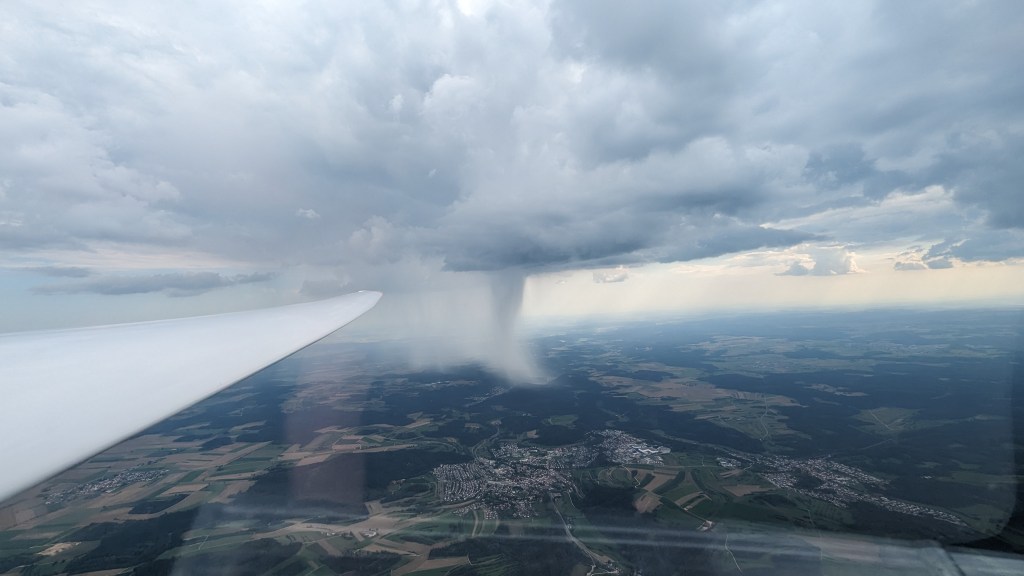 Nach kurzem Höhetanken beim Tennenberg ging es wieder unter eine Wolkenstraße.Ich genoss den Ausblick sehr und freute mich über die Bekanntschaft mit dem Schwarzwald (der viel netter ist als der Pfälzer Wald, was wahrscheinlich an der Verbindung zum Odenwald liegt, den ich auch sehr gerne mag. Zwischen Schwarzwald und Odenwald liegt der Kraichgau. Leider war die Wolkenstraße bald zu Ende und wir flogen wieder zurück nach Norden. Da auch heute wieder vor Gewittern gewarnt wurde und die erste Monsterwolke bereits im Tal stand, entschieden wir uns gegen den ursprünglichen Plan den Schwarzwald weiter nach Norden auszufliegen, sondern flogen eine ähnliche Linie wie beim Hinweg zurück. Wir wählten die Wolken, die direkt südlich der Monsterwolke in der Sonne standen. Das funktionierte auch wieder ausgezeichnet und wir kamen entspannt an der Wolke vorbei. Leider lichtete sich dahinter wieder das Wolkenbild und über Leibertingen (wo wir gemeinsam mit einer Blau-Gelb lackierten K6 kreisten…leider habe ich kein Foto gemacht) sprangen wir zu den letzten erreichbaren Wolken. Nachdem wir gewendet hatten, entdeckten wir, dass die erste Monsterwolke sich nördlich der Alb verzogen hatte, aber schon die nächste Monsterwolke im Tal stand. Und diese zweite Monsterwolke, war noch viel monströser als die erste Monsterwolke. Mein Vorschlag, wieder die südlichen einzelnen Wolken in der Sonne zu nehmen wurde erst einmal abgelehnt, denn Jürgen wollte mir zeigen, wie man am besten an der Monsterwolkenkante entlangflog. Da sie sich im Zentrum gewaltig ausregnete, musste sie ja irgendwo die Energie herbekommen. Alles klar! Es ging sensationell am Anfang der Wolke und wir kurbelten mit fast 3m/s und obwohl es schon leicht anfing zu regnen, ging es im Geradeausflug danach mit einem soliden Meter.
