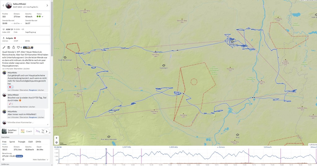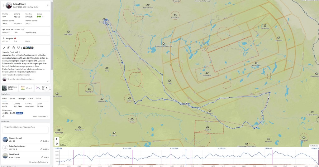Da es der letzte Wertungstag war, entschied sich die Wettbewerbsleitung für eine kleinere Strecke wieder in den Süden Brandenburgs. 313km RT zuerst südlich Holzdorf und dann Haldesleben. Natürlich auch hier wieder mit dem inzwischen altbekannten PEV. Ich stand relativ weit hinten im Grid und schmorte in der Sonne. So konnte ich Eva noch mit meinem Zweitakku aushelfen, da ihr Akku eine Seilrunde vor ihrem Start entschieden hat zu streiken. Daran, dass sie eigentlich meine Konkurrentin ist dachte ich gar nicht, sind wir doch alle Fliegerkameraden.