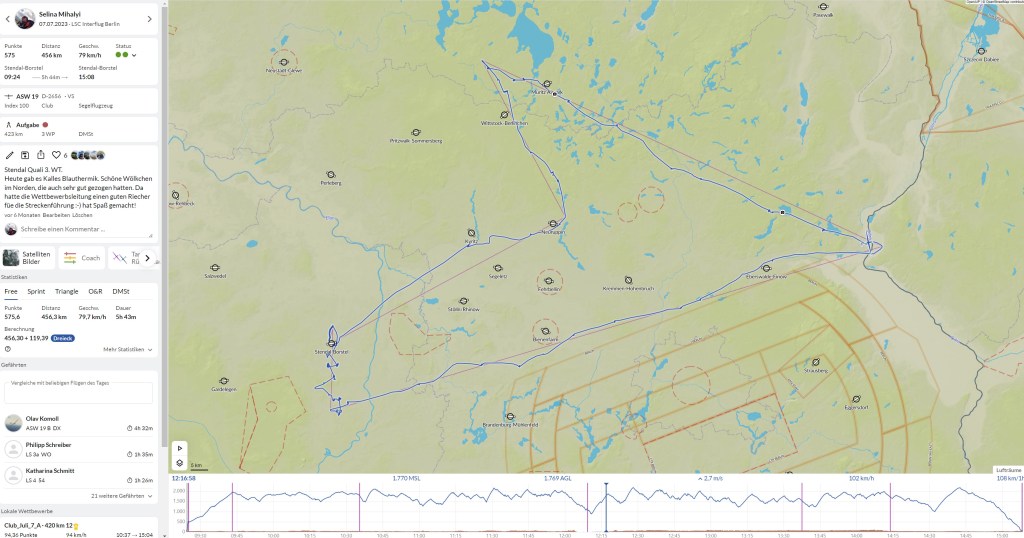 Allerdings machten wir einen Fehler, der uns erst später klar wurde. Durch die 35km Gleitstrecke über die Elbe, nahmen wir Geschwindigkeit heraus um Reserve zu haben. Dadurch, dass wir in genau dieser Gleitstrecke so langsam waren, fehlten uns bei der restlichen Strecke immer ein paar Minuten. Aber dazu später mehr. Als wir vor Wittenberg die Elbe kreuzten erkannten wir, dass unter der angepeilten Wolke hinter der Stadt ein paar Flugzeuge kreisten, die nicht schlecht stiegen. Durch unseren langen Gleitflug haben wir gute 1200m verbraten und in 1500m kam man sich bei dieser Basishöhe schon echt niedrig vor. Wir kreisten unten ein und freuten uns über 3m/s. Tja, jetzt kommt das große Aber! Dadurch, dass wir eher zurückhaltend geflogen sind, fehlten uns jetzt ein paar Minuten. Das Team vor uns konnte die Wolke noch gut bis oben auslutschen, bei uns fing sie langsam schon an abzubauen, sodass wir ein wenig schlechteres Steigen in Kauf nahmen, um wieder bis an die Basis zu kommen. Und so nahm das Unglück seinen Lauf. Diese leichten Trödeleien summierten sich, so dass sich jede Wolke, die wir daraufhin anflogen schon im Begriff war sich aufzulösen, als wir sie erreichten. Die Wolken zogen immer schlechter und irgendwann sah es wirklich dürftig zur nächsten Wende aus. Wir sammelten zwar hier und da immer ein paar Höhenmeter, aber der Brüller war es nicht mehr. Verdammt! Den letzten halbwegs brauchbaren Bart hatten wir bei Zerbst und bis zur Wende waren es sicher nochmal gute 60km und von dort noch einmal 45km nach Stendal. Wir sammelten hier und da mal wieder ein paar Meter, aber von einer Endanflughöhe waren wir noch weit entfernt. Natürlich löste sich auch die Wolke an der Wende vor unseren Augen auf und mit größter Mühe konnten wir dem Nachhauch noch 200Höhenmeter entlocken, die aber immer noch nicht reichten, um es nach Hause zu schaffen. Der Blick nach Norden verriet, dass es nun eine weiter Entscheidung zu treffen gäbe. Der direkte Weg über ein großes Wald- und Schießgebiet oder außen rum. Beim direkteren Weg hatte man die Chance ein paar Wolken abzufliegen. Wenn diese sich aber auch vor einem auflösen würden, hätte man ein mittleres Problem, denn man müsste erst einmal wieder in landbares Gebiet hineingleiten und das könnte knapp werden (ich bin ein Schisser). Zum Glück hatte es den Anschein, dass das Schießgebiet sich in der Mitte verjüngen würde, sodass man zur Not um 90° zur Seite abbiegen konnte. Also entschieden wir uns für den direkten Weg und hofften, dass die Wolken doch noch einige Minütchen durchhalten würden. Die Wende hatten wir in 1600m AGL genommen und wir flogen tapfer los. Und wir hatten tatsächlich Glück! An der Kante vom Wald- zum Schießgebiet stand eine Wolke, die uns direkt mit soliden 1,5m/s auf Endanflughöhe brachte. Ohne weitere Schweinereien kamen wir in Stendal an. Natürlich wieder viel zu langsam mit um die 93km/h, aber immerhin. Olav auf Platz 20, Ich Platz 22 und Hannes Platz 23.