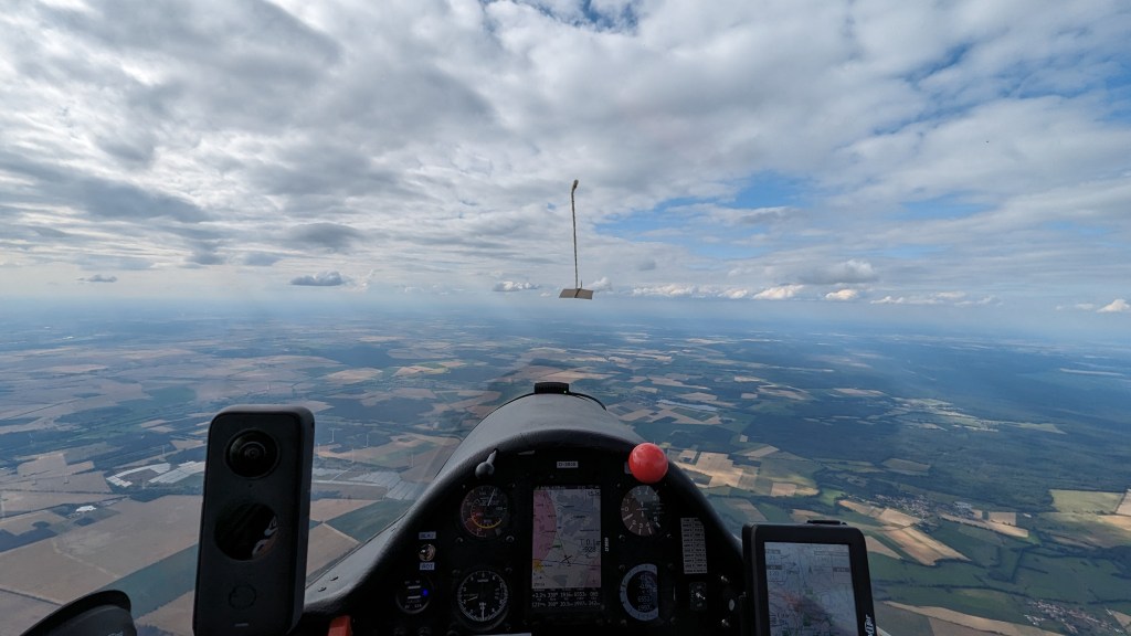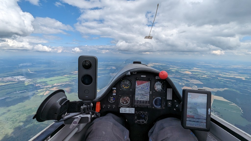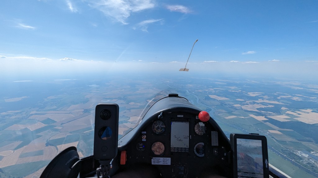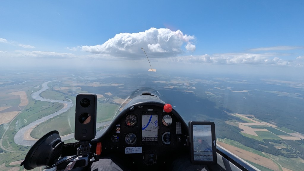 Variante A: mit den Anderen die gleiche Strecke zurück und dann nach Westen abbiegen, Umweg, aber Wolken. Variante B: der direkte Weg durchs Blaue über die Elbe. Am Horizont stand eine Wolke, die man mit dieser grandiosen Arbeitshöhe locker erreichen könnte, aber die Elbe ist bekannterweise sehr tückisch. Wir entschieden uns für die direkte Route und wurden vom Jantar „KY“ begleitet. Vor der Elbe sammelten wir an der letzten Wolke vorm großen blauen Loch noch einmal Höhe und in 2600m AGL ging es dann los.