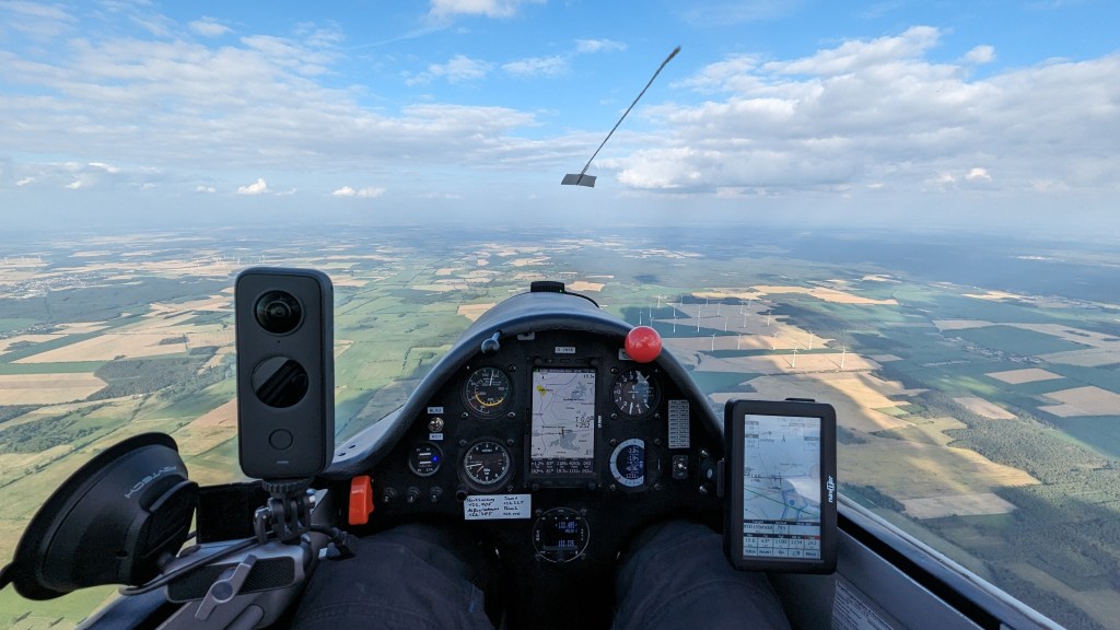 Die Clubklasse unseres Camp bildete ein kleines Team. Olav in seiner ASW19 „DX“ und Hannes in der LS4 „ED“ und ich wollten die Strecke gemeinsam bewältigen. So begannen wir die Strecke mit dem Abflug kurz hinter der Elbe mit der maximalen Abflughöhe in 1400m MSL. Die Standardklasse wurde nach unserem Abflug neutralisiert: zu viel Wind!