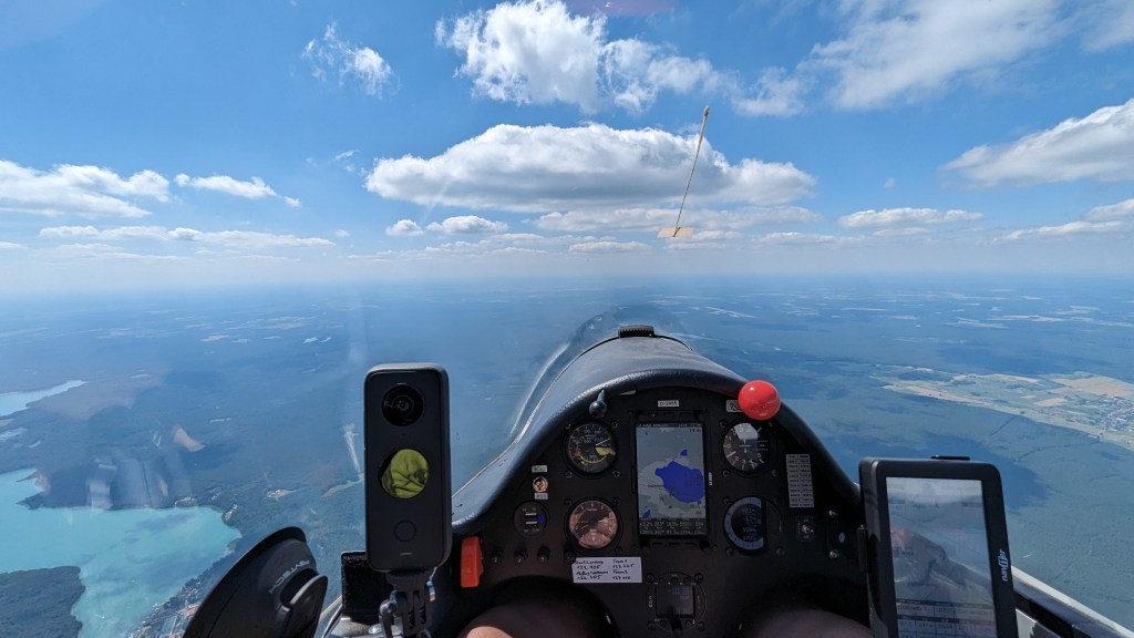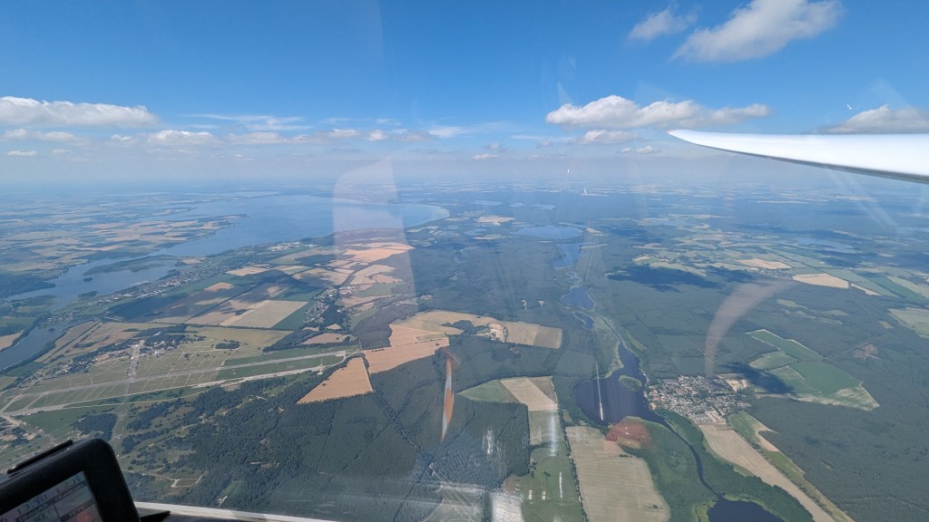 So schön die Wolkenstraße ging, sie war irgendwann vorbei und je näher man der Müritz kam, desto lichter wurde der Himmel und die einzelnen Wolken die kamen, zogen nicht mehr ganz so zuverlässig. Auf dem Weg zur Wende sah man einige Clubklasse-Kollegen, die relativ tief aus der Wende kamen. Kurz vorm Flugplatz Müritz kurbelten wir uns von 1100m auf 1700m unter der letzten Wolke (alles was darauf folgte, waren eher Fetzen als Wolken). Wir versuchten uns von Fetzen zu Fetzen zu hangeln und so gut auf Höhe zu bleiben wie es geht. Allerdings war die Thermik unter den Fetzen sehr demotivierend. Kreiste man bei einem 3m/s Varioausschlag ein, waren von den 3m/s nach in zwei Kreisen nur noch ein müder Meter geblieben, was definitiv zu wenig für diesen Tag war. So nahmen wir die Geschwindigkeit im Vorflug heraus und orientierten uns ein wenig an den andern.