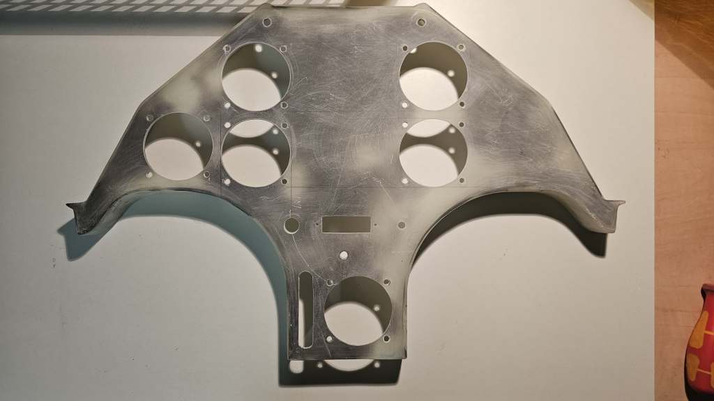 Wer (noch) keine CNC-Fräse hat oder Kontakt zu jemandem mit einer muss kreativ werden. Da ich schon alles in CAD vorbereitet habe konnte ich mir eine dünne Schablone für die Instrumente ausdrucken. Aufpassen, auch hier auf die Maßgenauigkeit achten! Alternativ kann man sein Layout auch auf Papier ausdrucken und mit einem Klebestift aufkleben. Damit ich etwas schneller bin habe ich mir für wenig Geld eine Edelstahl Schnittschablone für 57mm Instrumente gekauft. Also erst ein Loch bohren, Schablone mit einer Schraube und Flügelmutter montieren, die anderen Löcher bohren und dann den Ausschnitt per Laubsäge oder Dremel grob ausschneiden und z.B. mit einem Rundschleifkopf im Dremel in Form schleifen. Hier habe ich auch immer mal wieder die Instrumente genommen und geschaut, wo noch etwas wegmuss. Für das LX9050 habe ich mir selbst so eine Schablone gedruckt, welche sich anhand der umliegenden 57mm Instrumente orientiert. Wer Interesse an solch einer Schablone hat, kann sich gerne bei mir melden 😉. Alle unregelmäßigen Ausschnitte wie das Thermometer oder die Tankanzeige habe ich ausgemessen, übertragen und auch wie oben beschrieben ausgeschnitten.