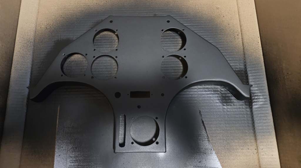 Eigentlich möchte man hier definitiv mit einem 2K-Lack gehen, wer mehr lackieren möchte kann sich ein 1kg Nextel gönnen, mir war das aber einfach zu teuer. Neuerdings gibt es noch einen neuen matten 2K-Lack, der auch in kleineren Packungen angeboten wird. Wenn man allerdings, wie ich, unbedingt einen Strukturlack haben möchte und doch etwas zu geizig ist, bestellt man dann kurzerhand eine 12€ Sprühdose „Bumperspray“. Mit diesem Sprühlack (1K!) werden normalerweise Plastikstoßstangen repariert. Ein Strukturlack hat allerdings auch Nachteile, z.B. das Sticker schlechter halten. Der Nachteil am „Bumperspray“ ist die nicht besonders hohe Kratzresistenz und evtl. die nicht so feine Oberfläche wie bei Nextel, außerdem gibt es das meistens nur in schwarz. Nach ~5 Schichten war allerdings die Vorderseite des I-Bretts Fertig, die Rückseite wird natürlich nicht mit lackiert. Ich finde ein schwarzes Instrumentenbrett lässt die Instrumente schön verschwinden sodass hauptsächlich die Zeiger zu sehen sind, nur fotografieren ist mit dem Licht immer schwierig.