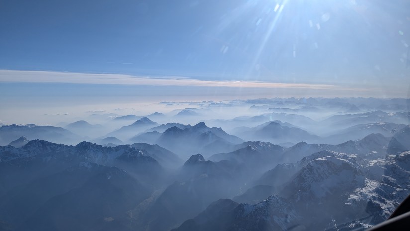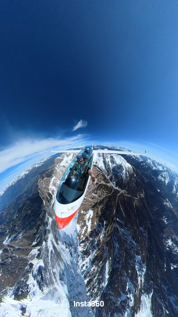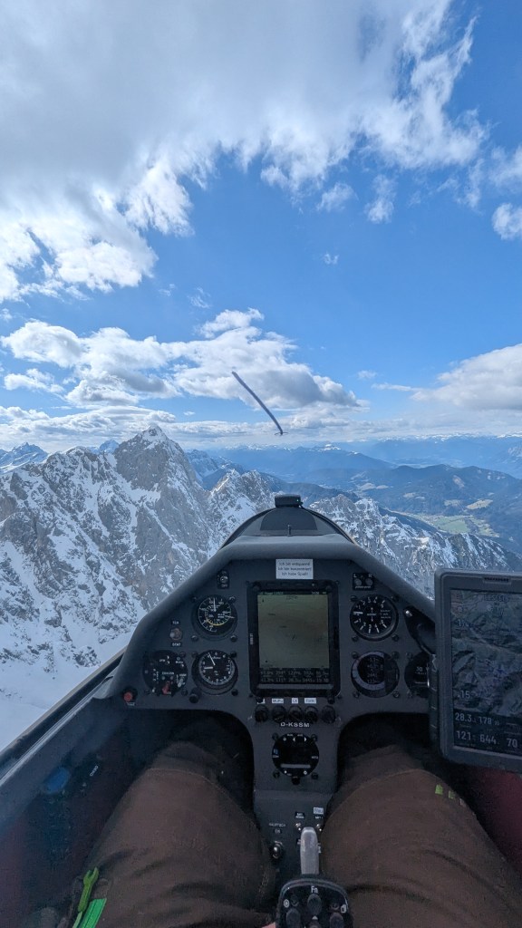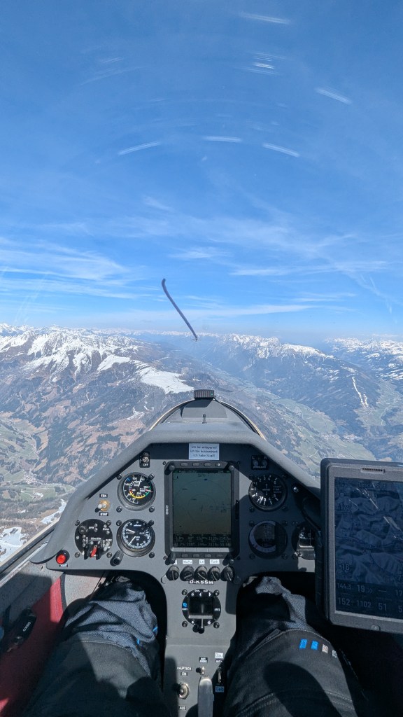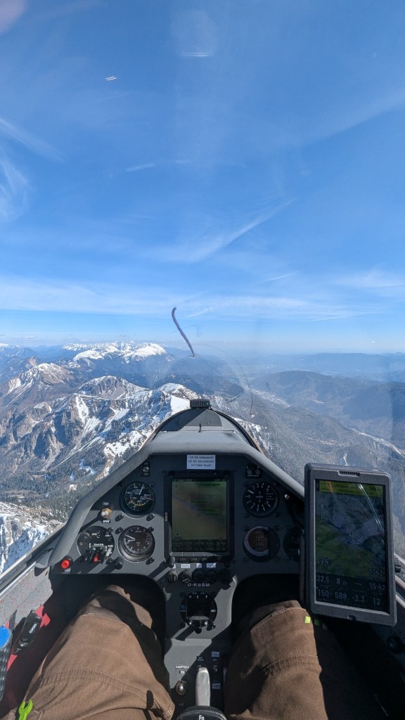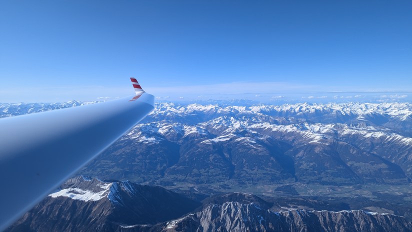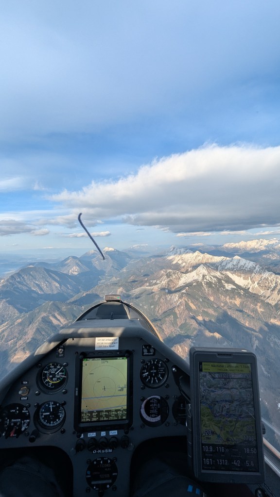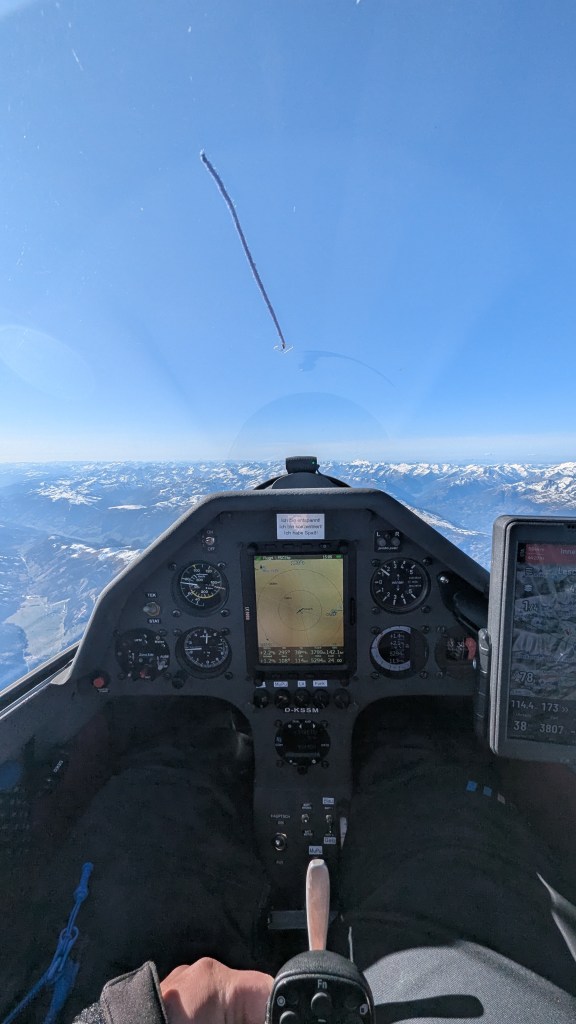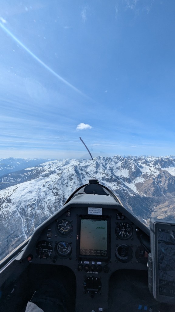 Ich war noch nie so hoch im Segelflugzeug geflogen und es ging immer weiter nach oben. Der Wind nahm mit der Höhe beachtlich zu und wir mussten immer wieder ein Stück vorfliegen, um in der Welle zu bleiben. Es war sensationell! Wir stiegen bis 5800m und die Aussicht war unglaublich! Die 2500m Hohen Berge der Alpen, denen ich eben noch ausweichen musste, waren tief unter uns und wirkten von hier oben wie harmlose Hügelchen.