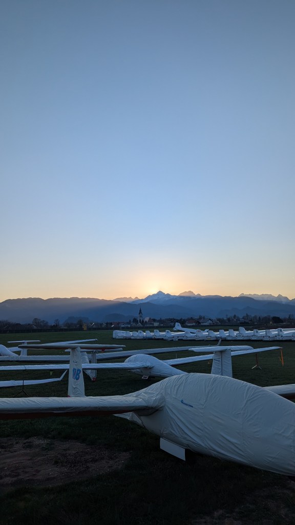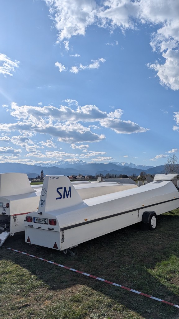 Am Freitag den 4. April ging es auch schon um 5 Uhr in der Frühe los. Da wir den Anhänger wieder bei Janki parken durften (danke dafür), sparten wir uns eine gute Stunde Fahrt und kamen auf dem Weg nach Süden ohne größere Verkehrseinschränkungen gut durch. Da dieses Mal Steffen mitkam, konnten wir uns mit dem Fahren abwechseln und fuhren die fast 1000km durch. Gegen 16:30 Uhr rollten wir bei bestem Wetter auf den Flugplatz Lesce. Die ersten Einweisungsflüge wurden bereits auf dem Janus und dem Duo Discus BW1 durchgeführt und hoch motiviert, rüsteten wir noch Spocky auf.