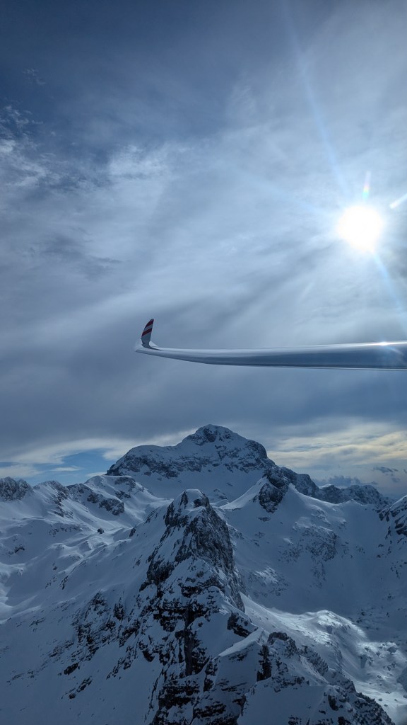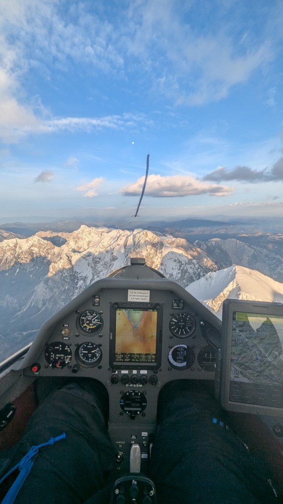 Mit eiskalten Pfoten folgte ich meiner Gruppe weiter nach Westen und wir konnten schön die Höhe halten. Nach einer Stunde in der Welle drehte Jürgen um und teilte uns per Funk mit, dass er so langsam den Abstieg beginnen würde, er friere nämlich auch. Also flogen wir ganz gemächlich in absurden Höhen wieder nach Osten. Es ist irgendwie ziemlich surreal, wenn der Endanflugrechner 4000m Ankunftshöhe auf Lesce rechnet. Aber natürlich konnten wir in dieser Höhe nicht in den Luftraum eintauchen und so wurde ordentlich Gas gegeben, um die Höhe zu vernichten (auch wenn das nicht gerade zuträglich für den Lack ist). Ordentlich durchgefroren kamen wir einige Zeit später wieder am Flugplatz an. Was für ein Erlebnis! Danke Jürgen!