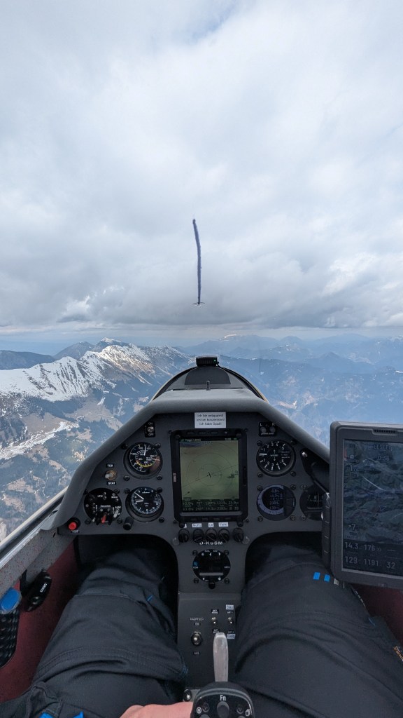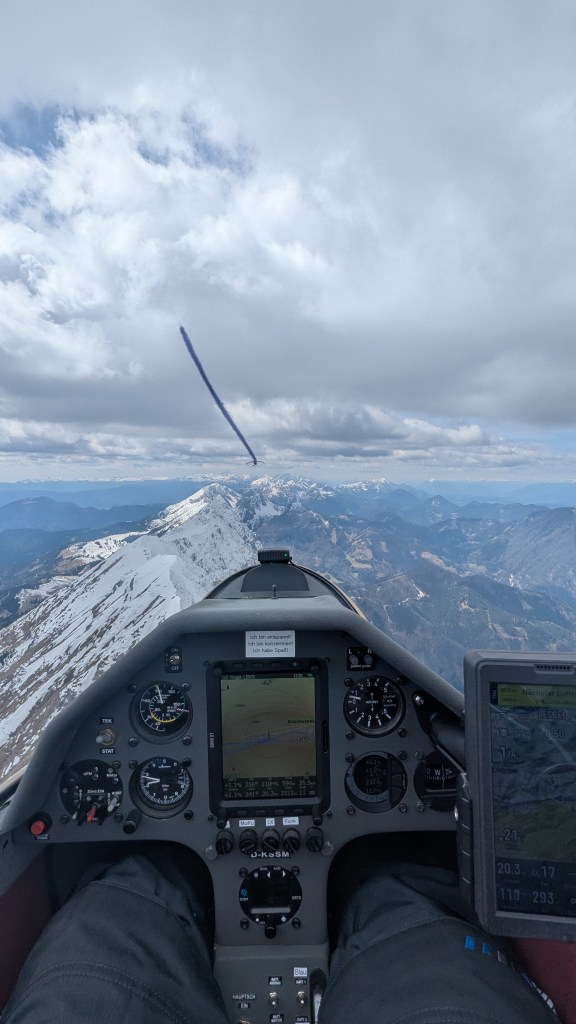 Lokal sah es am Platz gar nicht schlecht soooo aus, es standen hohe Wolken über dem Tal und auch der Schlepp ging eher unter diese Wolken, als an den Berg. Ich kuppelte in 1200m MSL (ca. 700m über Grund) unter einer Wolke östlich des Platzes aus und mit 2-3m/s ging es auf 2700m MSL. Jasmin kam von der Nachbarwolke zu mir und Veit sammelte uns kurze Zeit später auch ein. Der Plan war, uns über die Nordseite nach Westen vorzukämpfen. Zwischen Plan und Realität liegen bekanntlich (vor allem beim Segelfliegen) ab und an Welten. Wir erwischten eine grandios sinkende Linie und bogen bald wieder nach Süden zurück ins Tal.