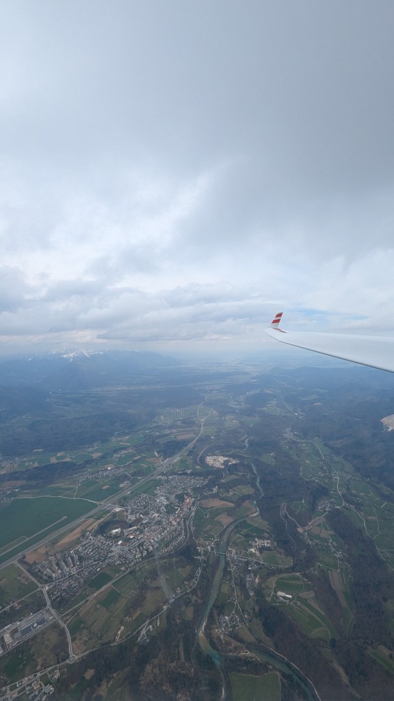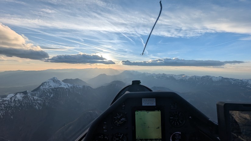 Der Flugzeugschlepp war sehr abenteuerlich. Es war ruppig und der Schlepper meinte, es wäre eine gute Idee mit mir in aktiver Thermik 45° Kampfkreise zu machen. Das Schleppseil machte hinter mir einen Bogen innerhalb von Sekundenbruchteilen entschied ich mich für das sichere Auskuppeln. Zwar war ich erst 400m über dem ansteigenden Gelände, aber mein Anflugrechner kalkulierte eine Ankunftshöhe von ebenfalls 400m auf Lesce. Ich kam also mit ziemlicher Sicherheit wieder auf dem Flugplatz an und fuhr den Turbo aus. Zum Glück kam dieser direkt und ich knatterte unter eine Wolke zwischen Flugplatz und Dob. Auch Jasmin war dabei und Veit sammelte uns etwas südlich des Begus ein. Leider erwischte Jasmin mit ihrer leichten DG100 eine schlechtere Linie als wir und bog zum Stol ab, um sich dort hochzuachtern. Wir flogen nach Osten Richtung Appalachen und wollten sie auf dem Rückweg einsammeln. Die Abschirmung kam von Westen und so hatten wir im hohen Gelände noch gute Wölkchen, die auch noch gut und zuverlässig zogen. Durch den Nordwind trugen die Appalachen ganz gut und an deren Ende sprangen wir einen Berg weiter nach Süden. Das Steigen war mit maximal 1m/s nicht der Brüller, aber nach einigen Sicherheitsmetern flogen wir einen Bogen, um wieder in unser Tal zu kommen. Knapp am Luftraum von Ljubljana vorbei switchten wir wieder auf die Südseite unserer bekannten Berge und suchten in ruppiger Leethermik sinnvolles Steigen.