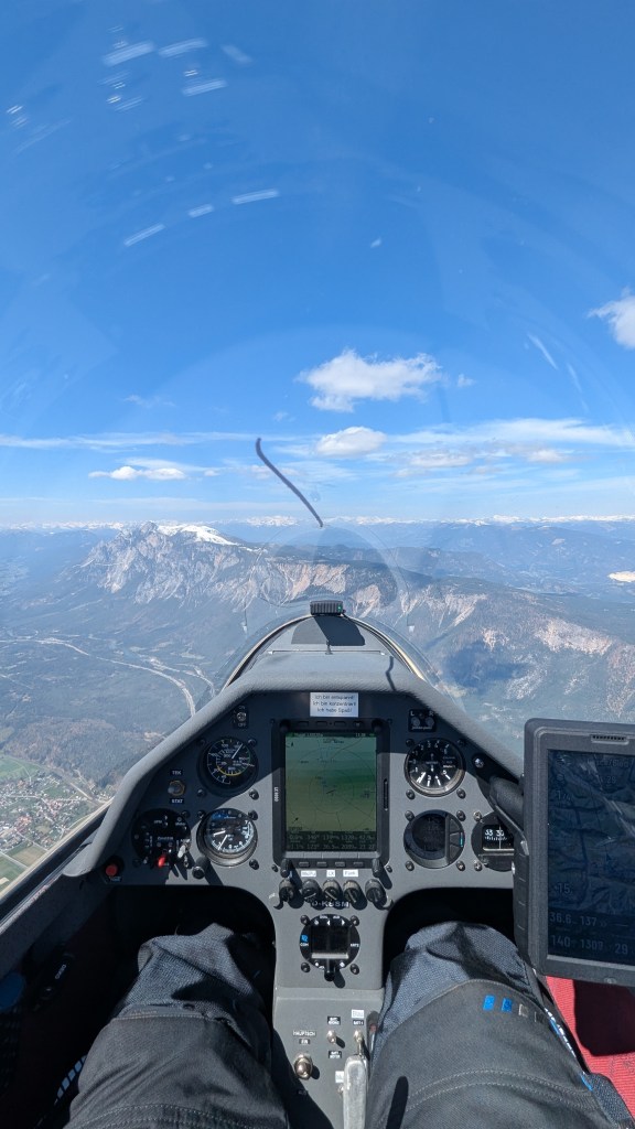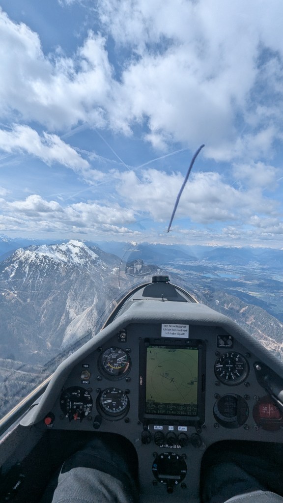 Und los ging es! Der Flugzeugschlepp an den Hang lief gut und wir kuppelten in 1400m MSL am Stol Ost aus. Leider ging die Flanke nicht sonderlich gut, sodass wir uns über dem kleinen Hügel erst einmal ausgraben mussten. Da es durch die Leethermik sehr ruppig war und ich mich erst einmal wieder mit den Bergen anfreunden musste, übernahm Abi freundlicherweise das Auskurbeln des Bartes, sodass ich die ersten Eindrücke in Ruhe verarbeiten konnte. Nachdem Abi uns in 2100m gekämpft hatte sprangen wir an die Westseite des Berges, wo ich das Steuer übernahm und uns mit 2700m auf eine gute Ausgangshöhe kurbelte, um den Sprung zum nächsten Berg sicher wagen zu können. So hüpften wir auf der bekannten Route von Berg zu Berg und am Wuzernpass wagten wir den Sprung zu meinem „Lieblingsberg“ dem Dobratsch nach Norden. Dort erkurbelten wir uns mit einer etwas fragwürdigen Route nochmal ein wenig Höhe, um auf die nördliche Bergkette des Gailtals zu springen. Leider war nach wie vor die Thermik durch die Leeeinwirkung sehr ruppig und schwer zu zentrieren. Da ich relativ selten Duo fliege und eher den agilen Discus gewöhnt bin, ist meine Ruderführung entsprechend. Ich korrigiere zu sehr das Querruder und stütze zu wenig mit dem Seitenruder. Dies führte zu so manchen Rüffel seitens meines Trainers. Es schallte regelmäßig von hinten „jetzt lass doch mal locker“ oder auch die legendäre Aussage „Das Querruder ist kein Kuhschwanz!“, worauf Abi von hinten demonstrativ mit dem Knüppel wackelte. Letztere Aussage ist übrigens seitdem ein Running Gag bei uns. Das Problem im Duo habe ich übrigens auch bei anderen Trainern. Ich habe so manche von hinten gefilmte Videos von Veit bekommen, die zeigen wie oft ich im Querruder korrigiere, was aber gar nicht nötig ist und nur unnötig Energie (sowohl Flugzeug-, als auch Sally-Energie) kostete.