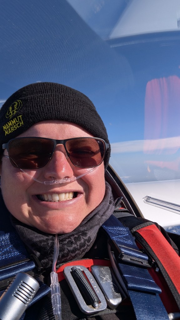Wir flogen nach Westen und mit fast 100km/h Windgeschwindigkeit in der Höhe, war die Groundspeed Anzeige ziemlich lustig. Gefühlt flogen wir auf der Stelle. Ich genoss die Aussicht und war von den Eindrücken total geflasht. So geflasht, dass ich vergaß durch die Nase und somit der Sauerstoffkanüle zu atmen, was ich kurze Zeit später merkte. Die Luft hier oben war doch um einiges dünner und nach ein paar beherzten Atemzügen durch die Nase, war ich aber wieder voll da. Irre, wie man die ersten Anzeigen von Hypoxie dann doch merkt. Nachdem ich das Atemproblem gelöst hatte, musste ich das nächste Luxusproblem angehen, was ein Wellenflug mit sich bringt. Die Kälte! Da Thermometer zeigte fast -25°C