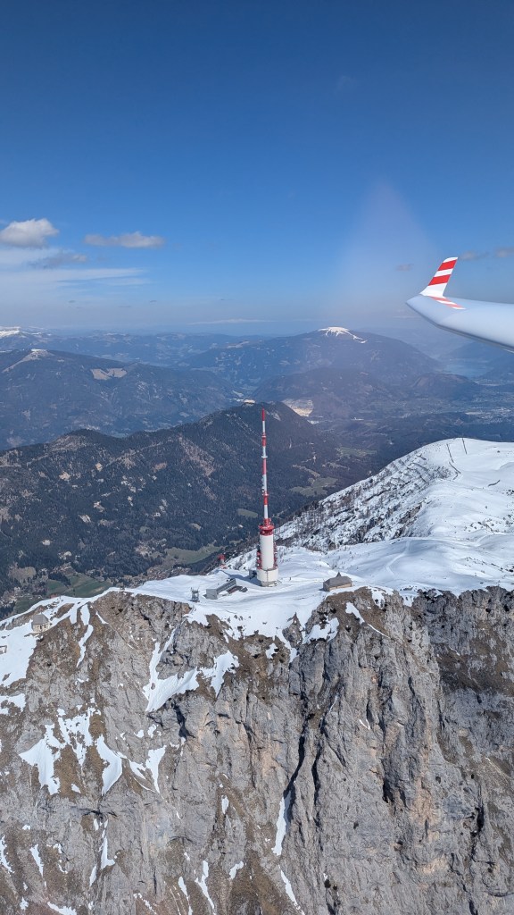 Am Mittagskogel sammelte mich mein Team ein und es ging ein Stück weiter nach Westen. Allerdings verloren wir ziemlich an Höhe, sodass wir zur Querrippe ins Tal flogen, um dort einen von der Sonne ausgelösten Bart zu erwischen. Da machte ich einen großen Fehler. Ich wählte eine sehr schlechte Route (im Nachhinein betrachtet macht das Sinken dort Sinn, nur für mich als Flachlandpilotin ist es noch schwer im Flug die Zusammenhänge im Gebirge zu erkennen), sodass ich 200m unter dem Duo einkreiste. Tja, wo dieser noch stieg, sank ich und auf der Suche nach einem brauchbaren Steigen auf meiner Höhe verbastelte ich mich komplett. So knapp über die Kanten wollte ich nicht fliegen und ich warf im Tal meinen Motor an und bog nach Osten ab. Dies brachte mir bei Debriefing Abends einen berechtigten liebevollen Anschiss ein: Rainer sagte mir ich solle den Motor in Richtung Westen des Tals anwerfen, aus irgendeinem mir nicht mehr nachvollziehbaren Grund bog ich nach Osten ab. Die konstruktive Kritik seitens des Trainers war mehr als angebracht, befanden sich die landbaren Felder, falls der Motor nicht käme, westlich von uns. Ist ja zum Glück alles noch einmal gut gegangen und das würde mir nicht mehr passieren, meine Lektion hatte ich gelernt. Aber nun wieder zurück zum eigentlichen Flug. Mithilfe der Kraft der zwei Kerzen wurschtelte ich mich wieder nach oben und wir flogen noch ein Stück weiter nach Westen zum Wurzenpass.