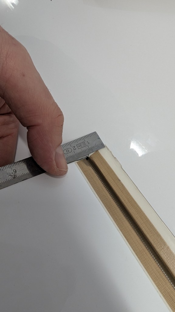 - Teflonband ausmessen: Mylarband auf obere Flächenkante anlegen, Breite auf Querruderseite ausmessen, auf der sich Mylarband später bewegt (muss am Ende zwischen dem Querruder und Mylarband sein, sonst zerkratzt Mylarband das Querruder). Bei meinem Discus waren das 17mm.